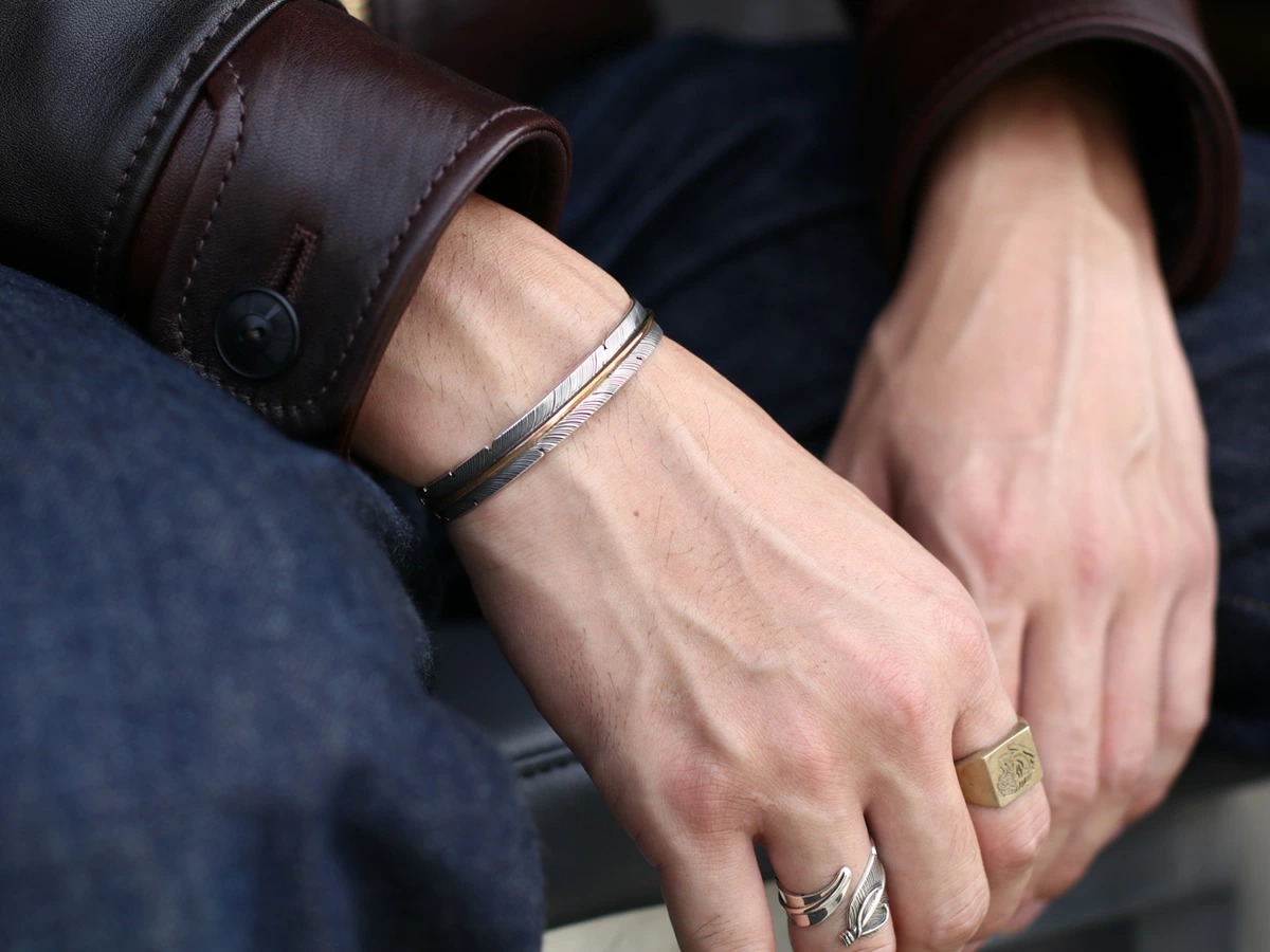 フェザーリングと同じ作者John Nelson(ジョン ネルソン)が得意とするフェザーモチーフのバングル。 綺麗で繊細なフェザーの動き。バングル中央の金色に輝きを放つ12k GOLD FILLEDなど熟練した技術で作成した作品です。