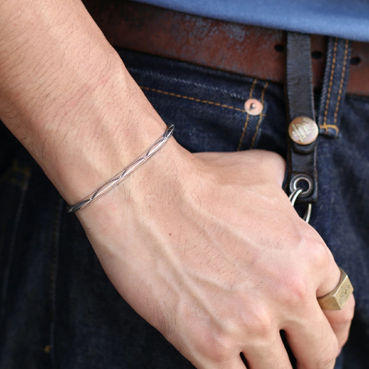 シンプルなスタンプワークが印象的なナロータイプのトライアングルバングル。年齢や性別に関係なくお楽しみ頂けるアイテムです。