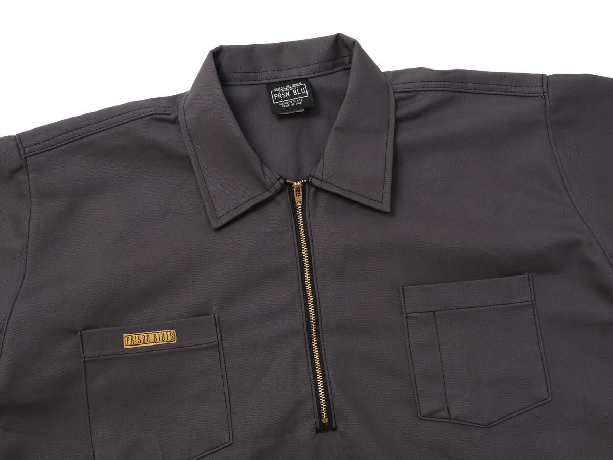 チャコールショートスリーブワークシャツ/ハーフジップは、耐久性と快適性のために耐水性の8 オンスのコットンツイル100%で作られています。実用的なジッパーフロントが特徴的で、着脱しやすく雨風から保護してくれますので様々なシーンでの活躍が期待できます。両胸にポケットがあり使い勝手が良くシンプルなデザインの中、右ポケットにPrison Bluesのロゴパッチのワンポイントが光っています。
