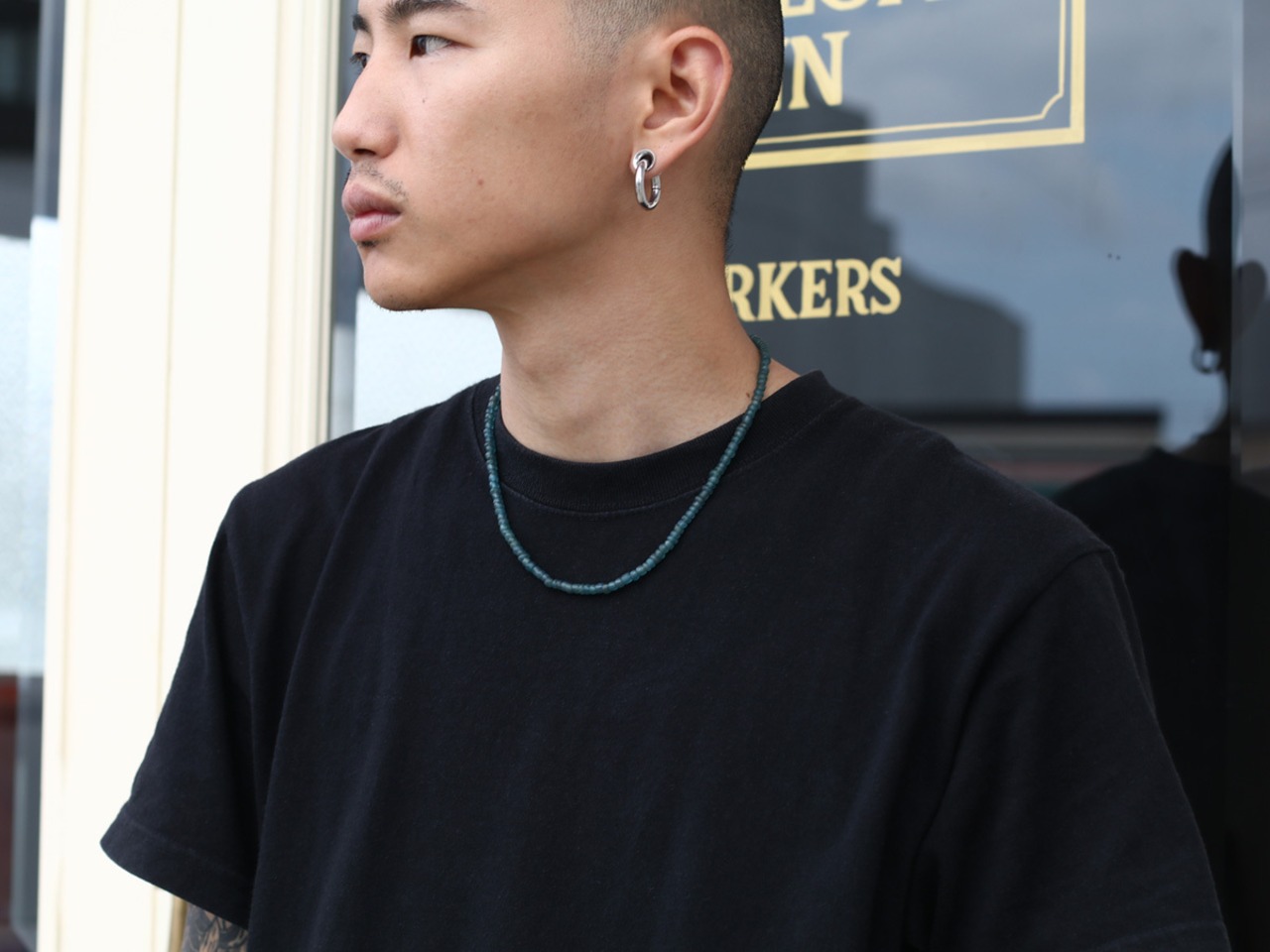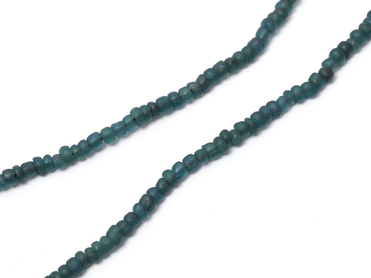 自然光に向けると透き通る味わい深いブルー系アンティークビーズ。半透明でマットな色合いはレギュラーからビンテージウェアーまで幅広いコーディネートをお楽しみ頂ける1本です。