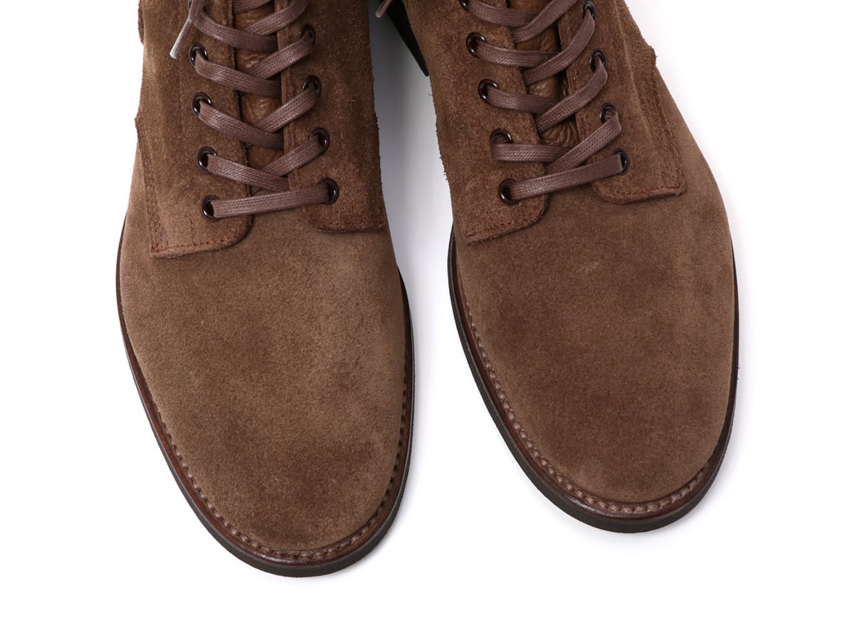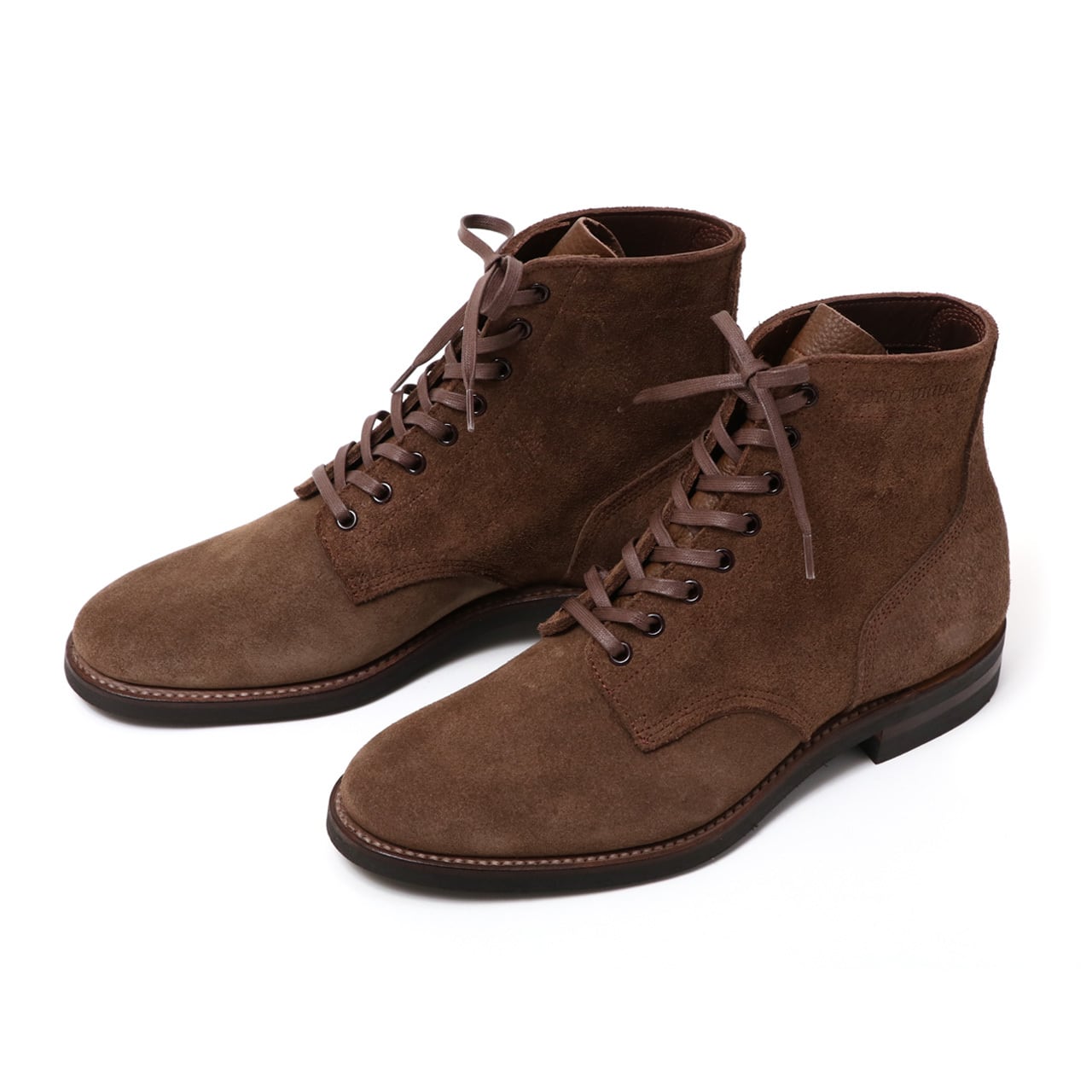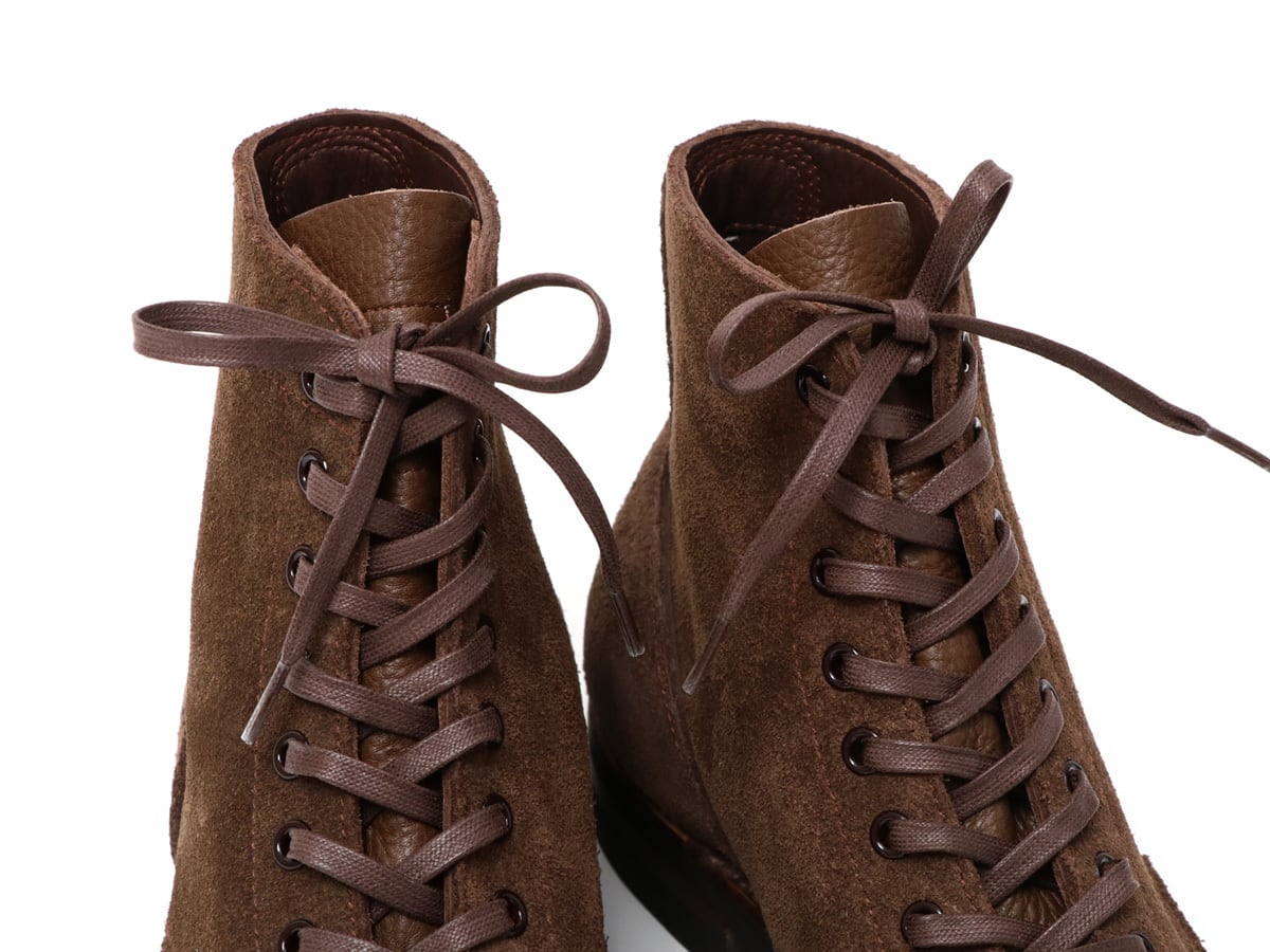 上質な革だからできる無駄を一切削ぎ落とした、一枚革(アンラインニング仕様)のラフアウトブーツ。ビンテージのService Bootsの特徴でもあるトゥの芯材を抜く仕様を採用。柔らかいタッチのBootsですが、薄い甲と絞られた土踏まずのフィッティングは高い職人技術の表れです。靴作りに生涯を捧げた職人が創り出す逸品のBoots。しっとりとしたタッチの毛並みとCHESTNUT BRN(チェスナットブラウン)の味わい深い色味も一緒にお楽しみください。