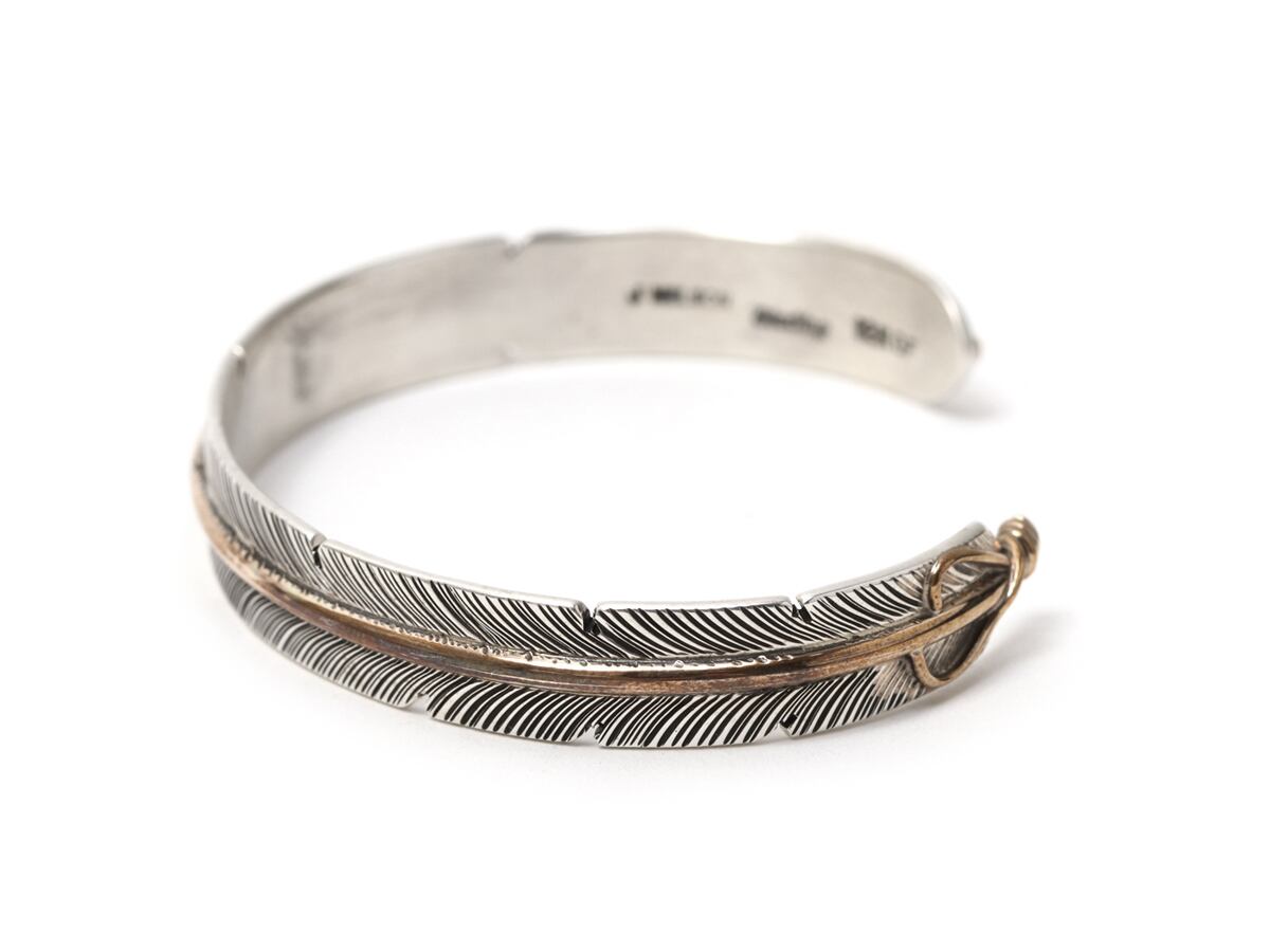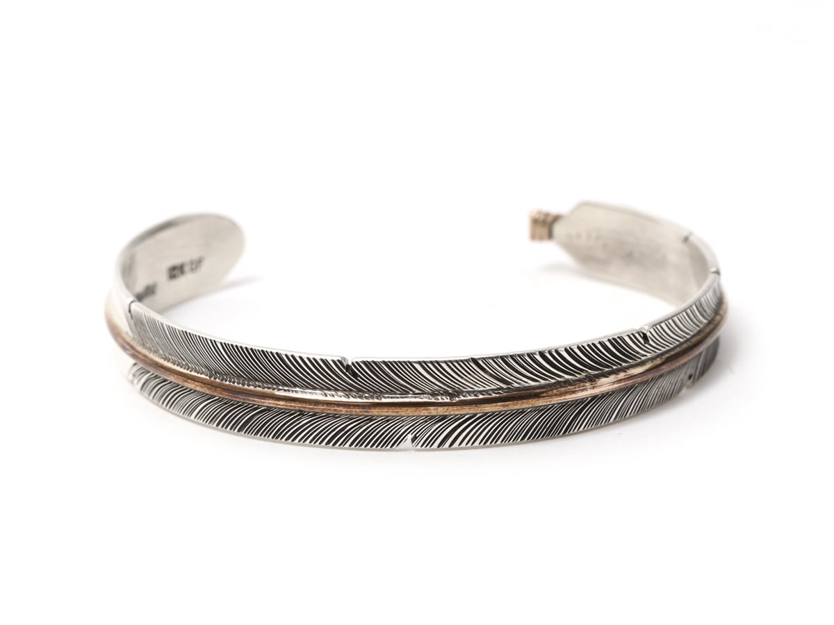John Nelson(ジョン ネルソン)が得意とするフェザーモチーフのバングル。綺麗で繊細なフェザーの動き。バングル中央の金色に輝きを放つ12k GOLD FILLEDなど熟練した技術で作成した作品です。