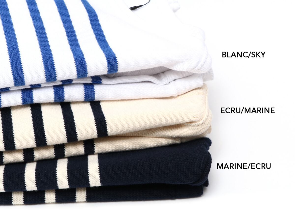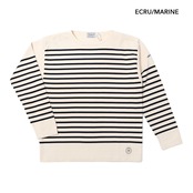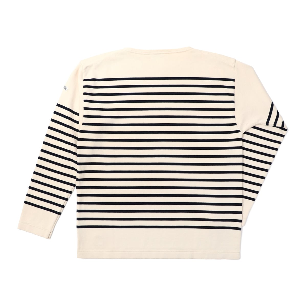 また肩部分は2重に縫製されており、補強や伸び止め等の機能的な側面と共に、同社の製品を特徴づけるアイコンとも呼べるデザイン上のアクセントとなっています。元来、船乗り達のワークウェアーであった同社の製品は、生産効率と耐久性を重視するプロダクトです。ほぼ真四角に編まれた身頃のパーツは上端の両端を折り返し、前身と後身を重ね合わせリンキングされます。四角に編むことで効率はあがり、重ね合わせて縫製されることで、伸び止めと補強を兼ね備えた二重仕立てのショルダーラインが構築され屈強な物となります。創業者のピエールが考案したと言われている普遍的なディテールです。