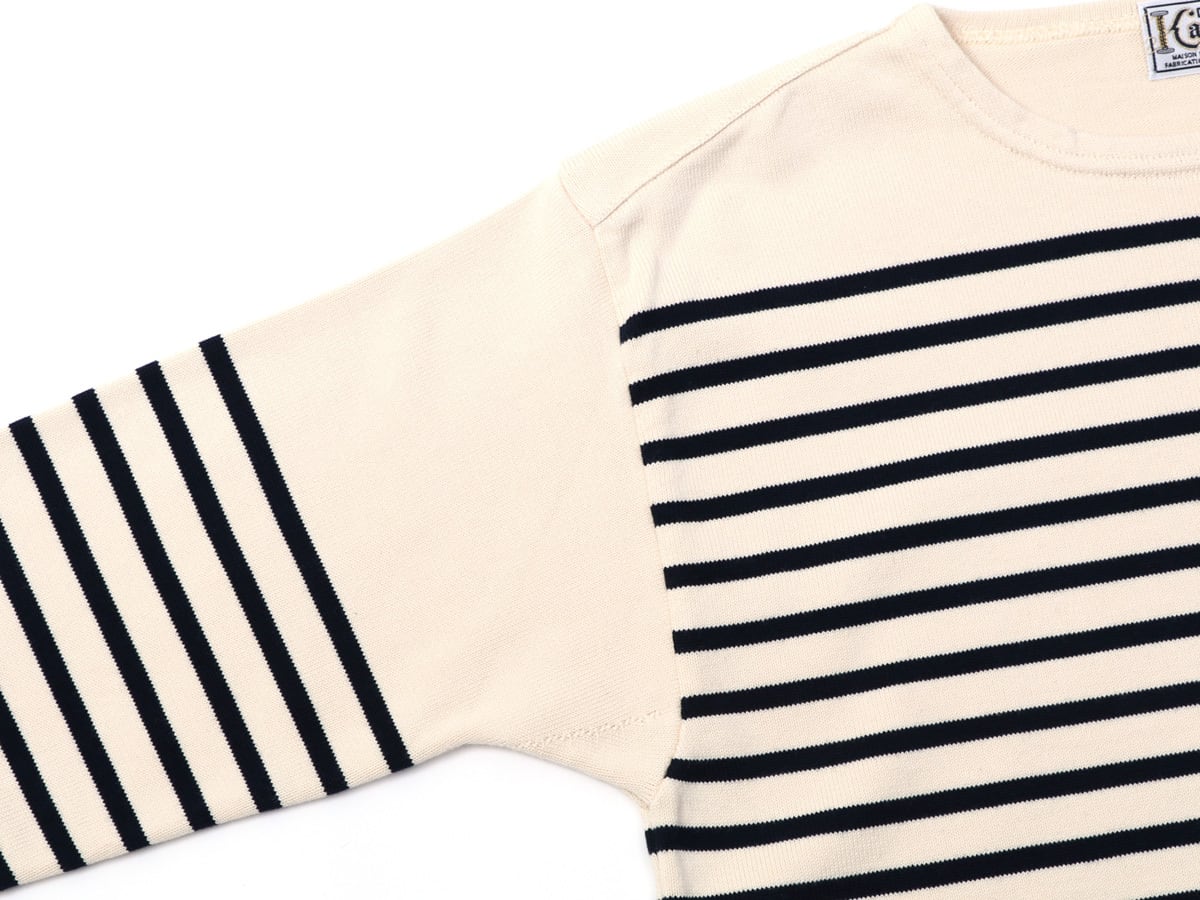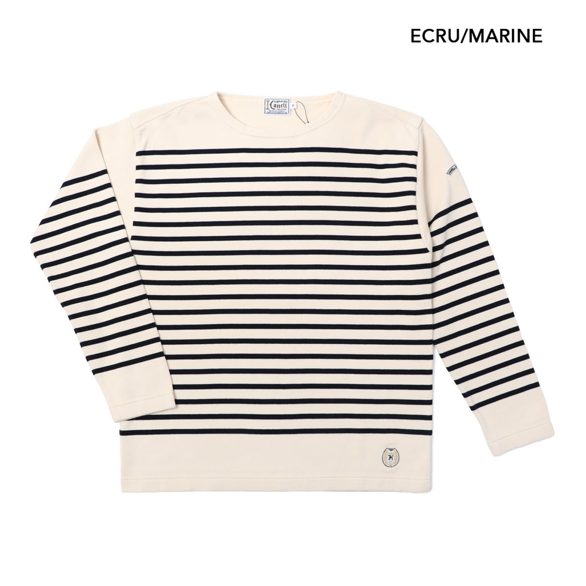 BONAPARTE(ボナパルテ)に用いられる身生地は目の詰まったしっかりとした編地です。VINTAGE JERSEYと呼ばれるその編地の特徴は何といってもそのウエイト。一般的にヘビーウェイトと呼ばれるKANELL社のお家芸ともいえる横編み機を用い、しっかりと編み込まれていきます。極限まで度目を詰め、タイトに編み込まれたその編地は、重厚でありながら横編み独自の柔らかさを兼ね備え『Armure de Marin…船乗りの鎧』と称される屈強なものとなります。洗えば洗うほど編み目がしまり、ドライタッチに変化していくさまはエイジングの楽しさにも溢れています。ヘビーウェイトな生地ながらも、ドライな質感のおかげで清涼感に溢れ、シーズン問わずご着用頂けるモデルとなっています。