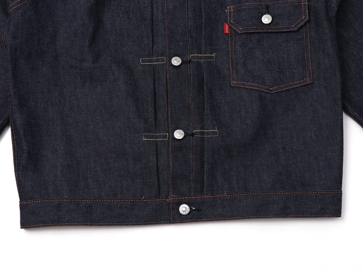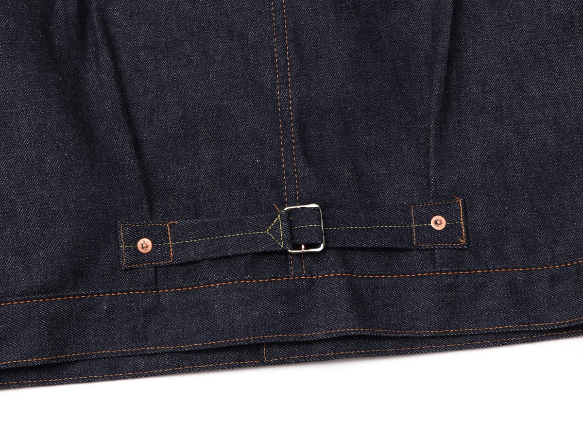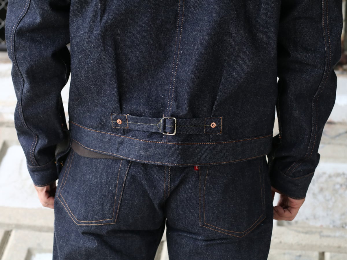 『生地は織り上げたままの生機で、毛焼き、防縮加工は一切なしで、大戦モデルオリジナルの生地を分析して織り上げたものです。ボタンは全て鉄で、リベットも鉄に銅メッキ、シンチバックに関しては、当時のオリジナルのリプロダクト品です。ボタンの裏のツープロングもオリジナルを見るかのような鍋底型になっております。糸も全てカタン綿糸。リベットのブランドロゴは1つ1つ両面を手打ち。縫いあげたミシンも当時使われていた名機種でユニオンシンガーにこだわっています。あとは、当時の色落ちをお客様自身で作って頂きたいです。』