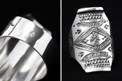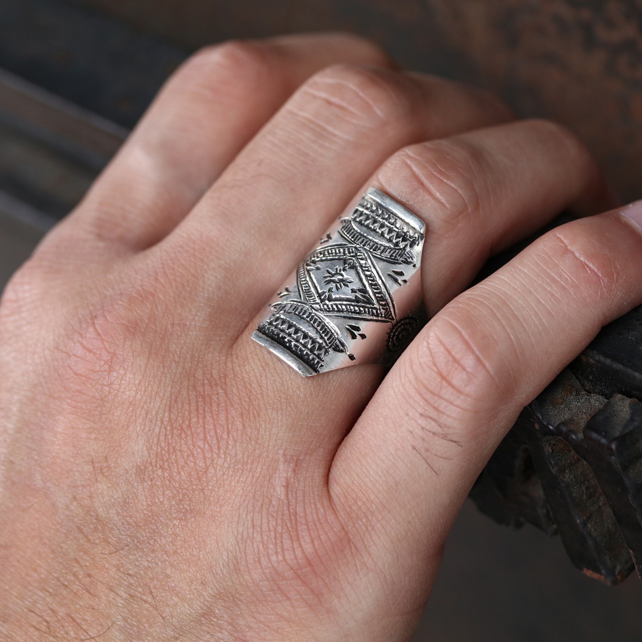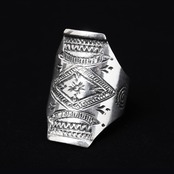 伝統的な民族柄を全て手作業で彫り込んだ作品。トゥアレグ族のジュエリーの模様には、家紋、戦への勝利のお守り、砂漠での道に迷わないための魔除け、交易の安全を願うお守りといった意味があります。シールド(盾)に似たデザインが印象的なリング。贈り物としても最適なアイテムの1つです。