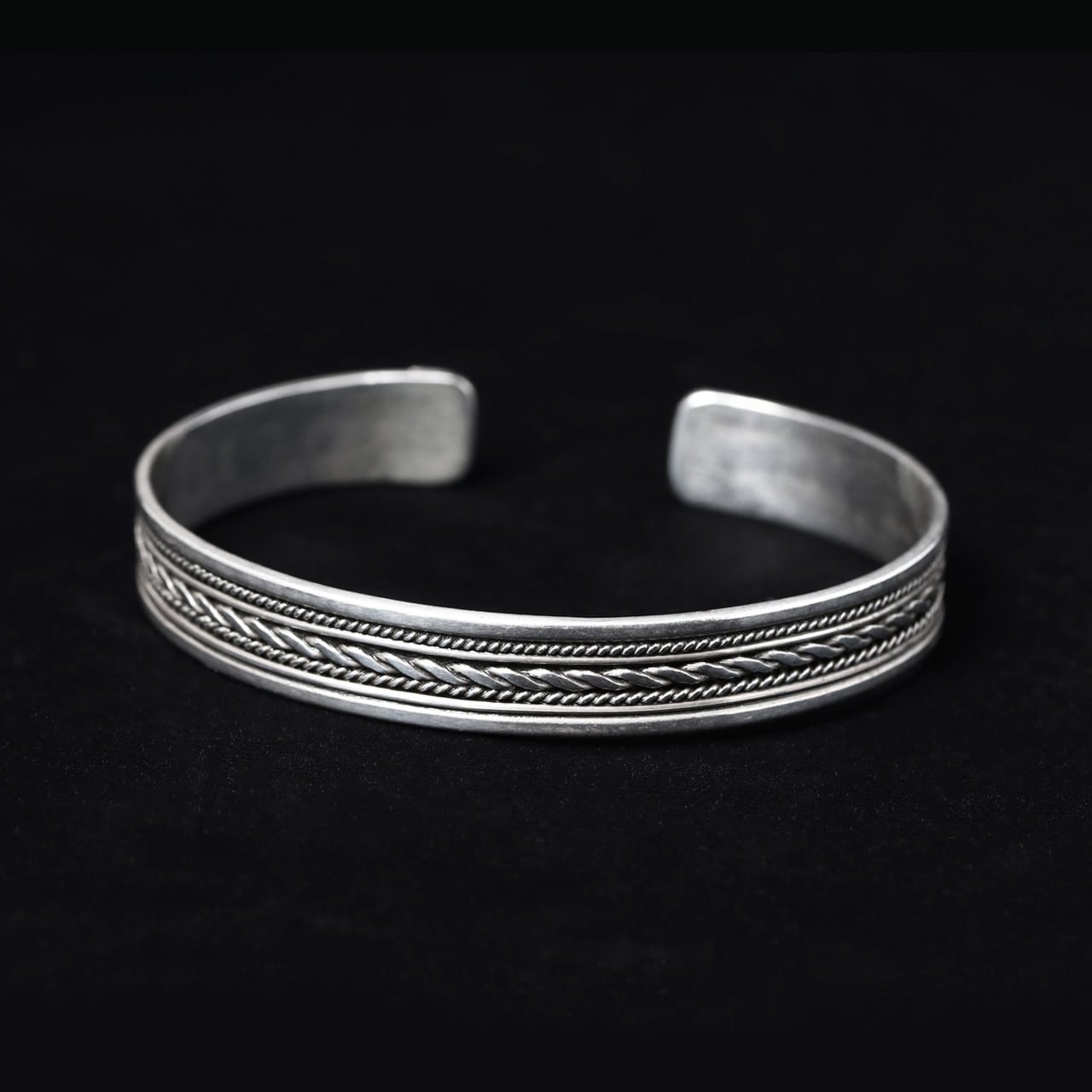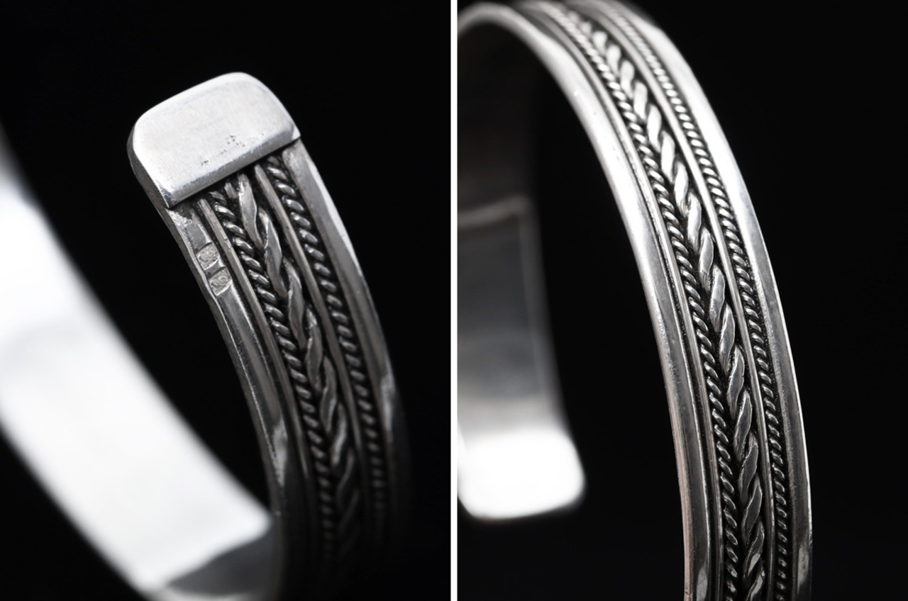ネイティブアメリカンジュエリーにも精通するディテールのワイヤーパターンが印象的なナロータイプのバングル。トゥアレグ族のジュエリーの模様には、家紋、戦への勝利のお守り、砂漠での道に迷わないための魔除け、交易の安全を願うお守りといった意味があります。シンプルなデザインで年齢や性別を問わずお楽しみ頂けるアイテムです。