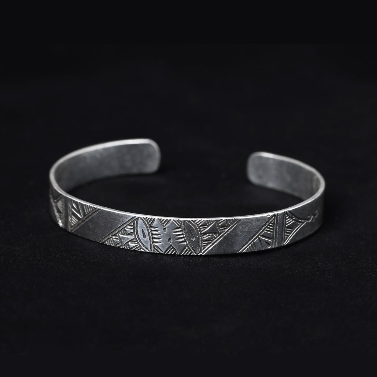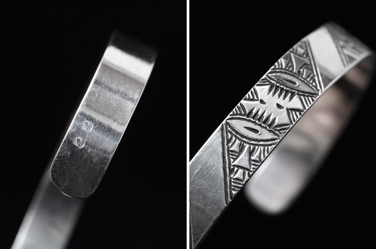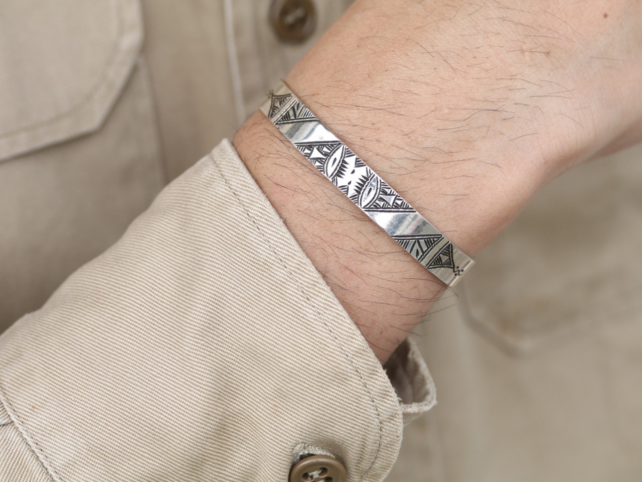 伝統的な民族柄を全て手作業で彫り込んだナロータイプのバングル。トゥアレグ族のジュエリーの模様には、家紋、戦への勝利のお守り、砂漠での道に迷わないための魔除け、交易の安全を願うお守りといった意味があります。シンプルなデザインで年齢や性別を問わずお楽しみ頂けるアイテムです。