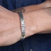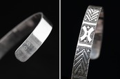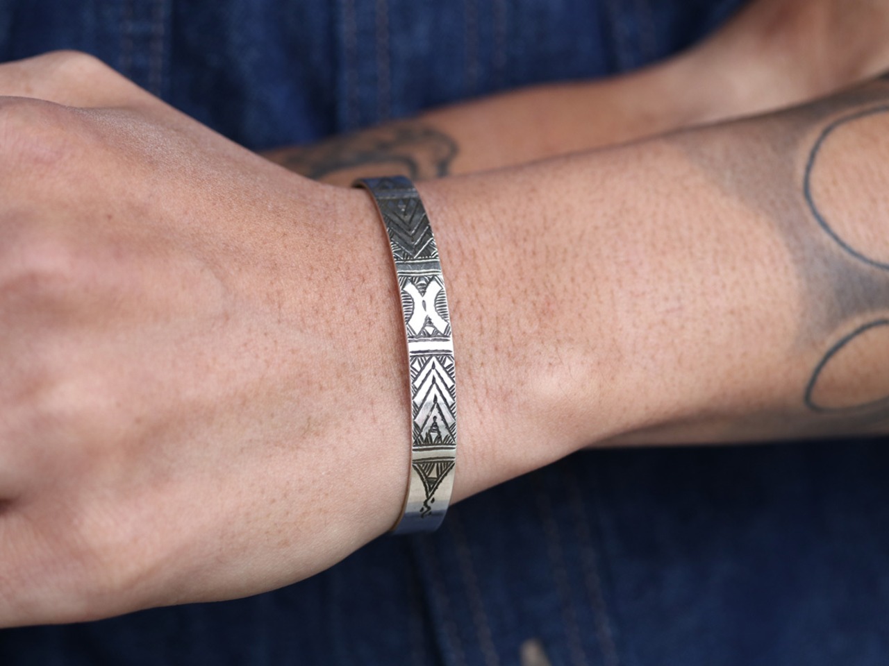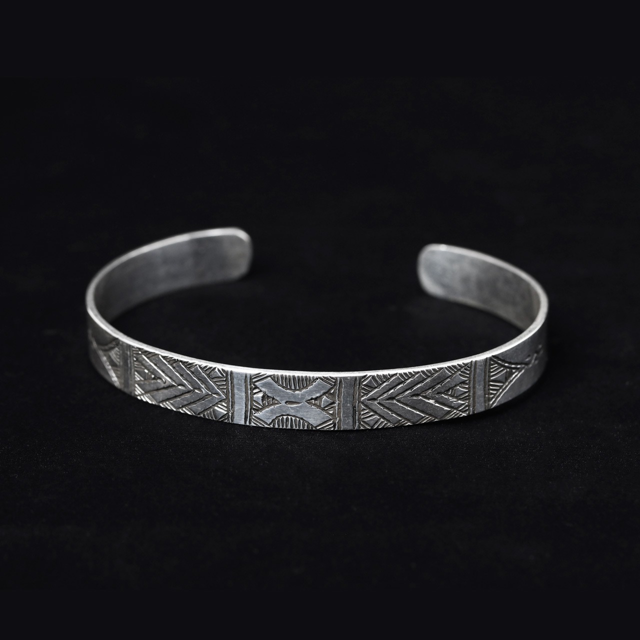 伝統的な民族柄を全て手作業で彫り込んだナロータイプのバングル。トゥアレグ族のジュエリーの模様には、家紋、戦への勝利のお守り、砂漠での道に迷わないための魔除け、交易の安全を願うお守りといった意味があります。シンプルなデザインで年齢や性別を問わずお楽しみ頂けるアイテムです。