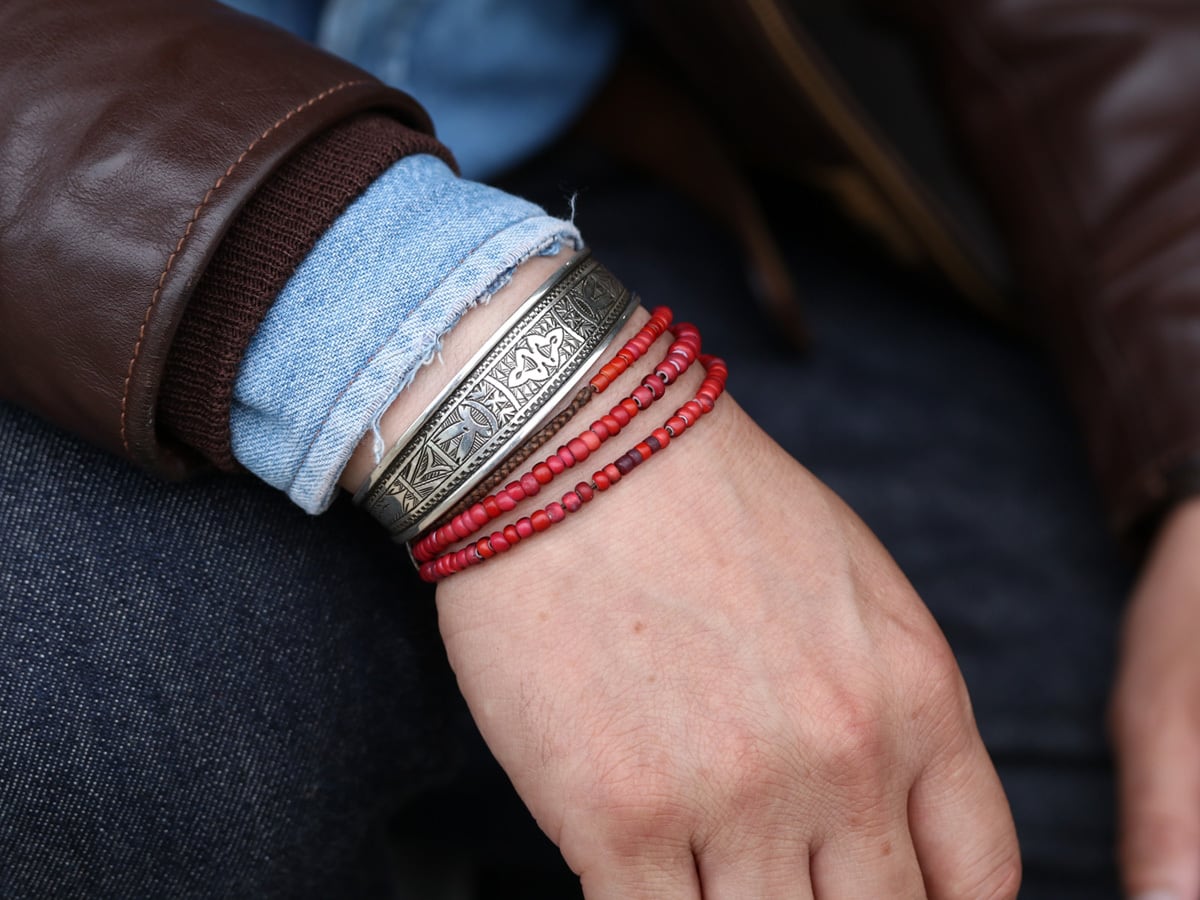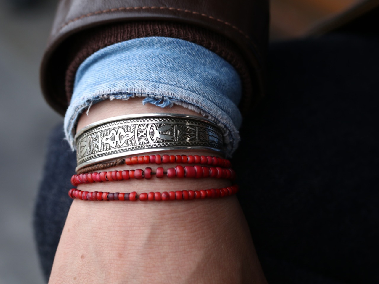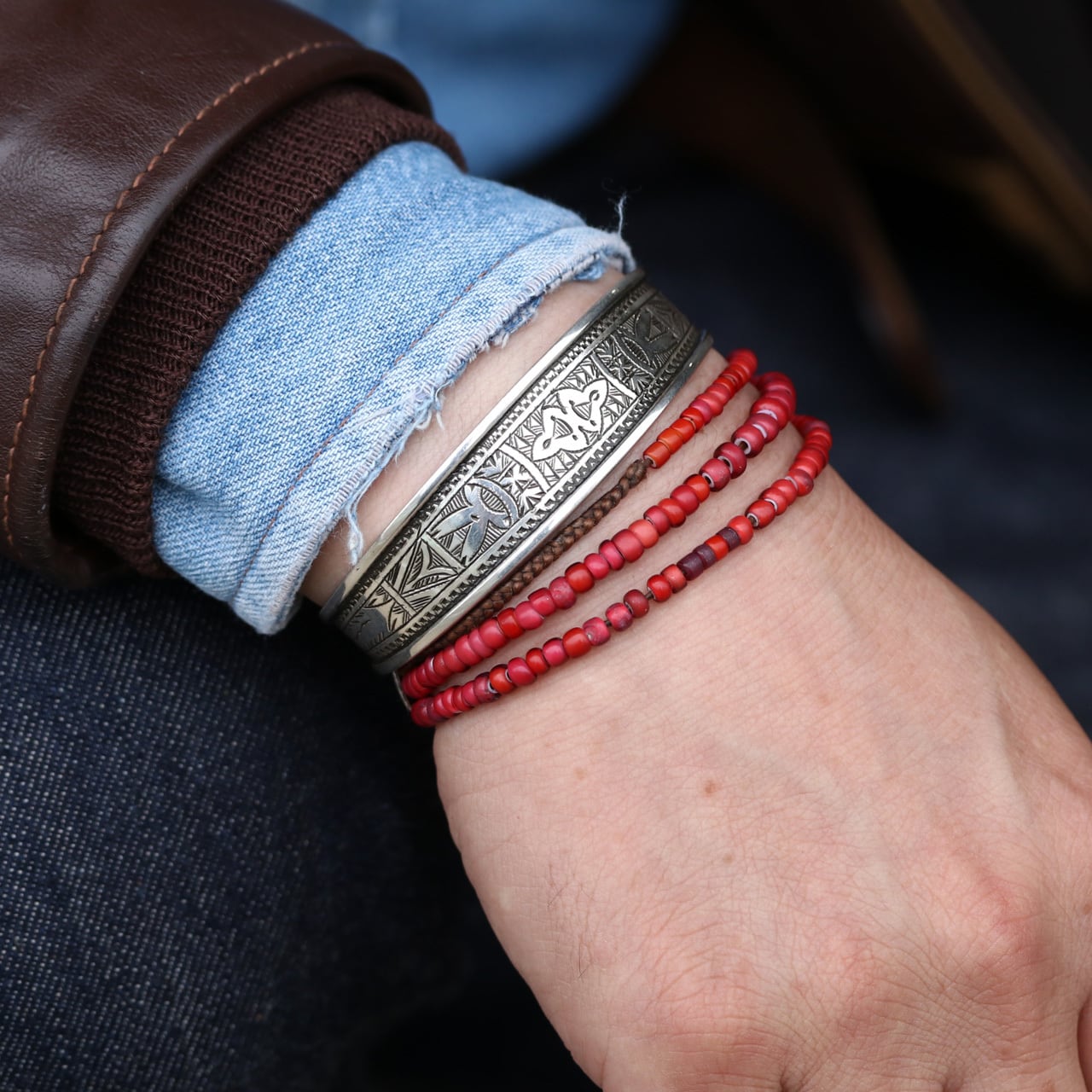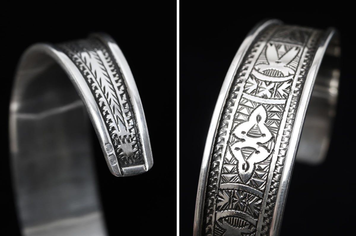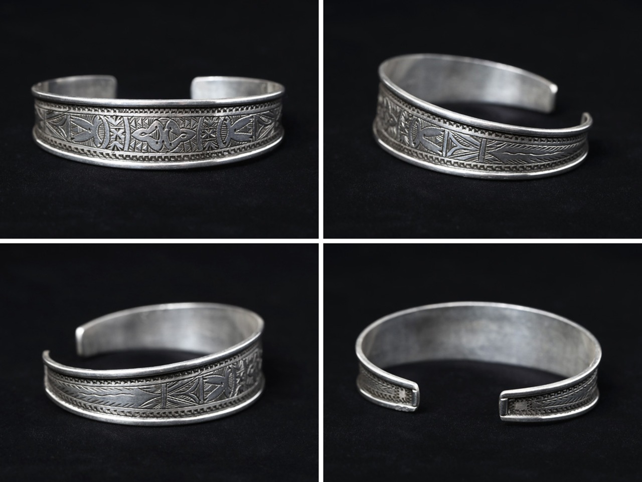 伝統的な民族柄を全て手作業で彫り込んだ作品。トップ部分から開口部にかけて徐々に細くなっていくテーパータイプのバングルです。トゥアレグ族のジュエリーの模様には、家紋、戦への勝利のお守り、砂漠での道に迷わないための魔除け、交易の安全を願うお守りといった意味があります。シンプルなデザインで年齢や性別を問わずお楽しみ頂けるアイテムです。
