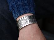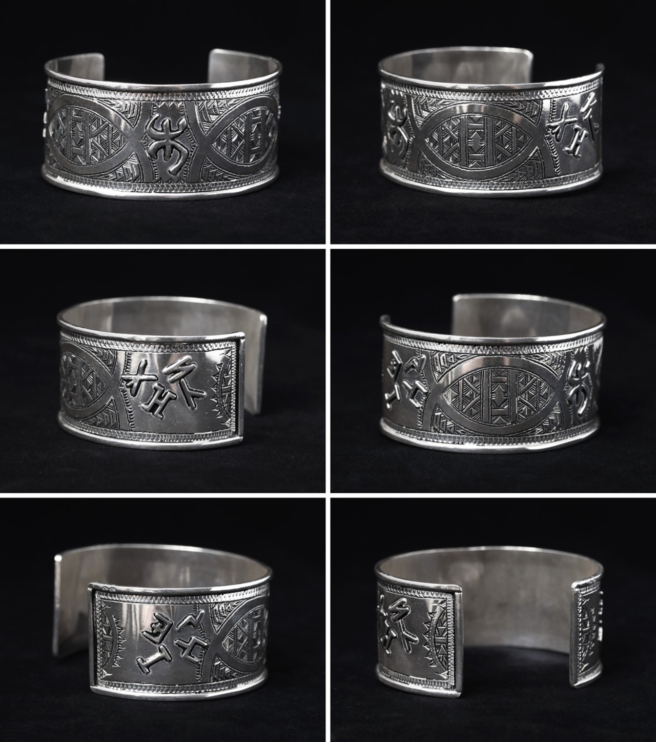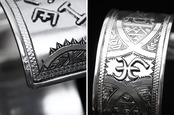 伝統的な民族柄を全て手作業で彫り込んだ作品。幅が29mmほどある存在感あるワイドタイプのバングルです。トゥアレグ族のジュエリーの模様には、家紋、戦への勝利のお守り、砂漠での道に迷わないための魔除け、交易の安全を願うお守りといった意味があります。シンプルなデザインで年齢や性別を問わずお楽しみ頂けるアイテムです。
