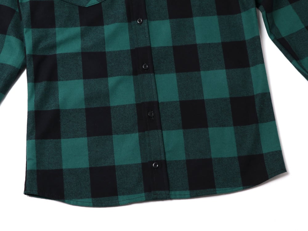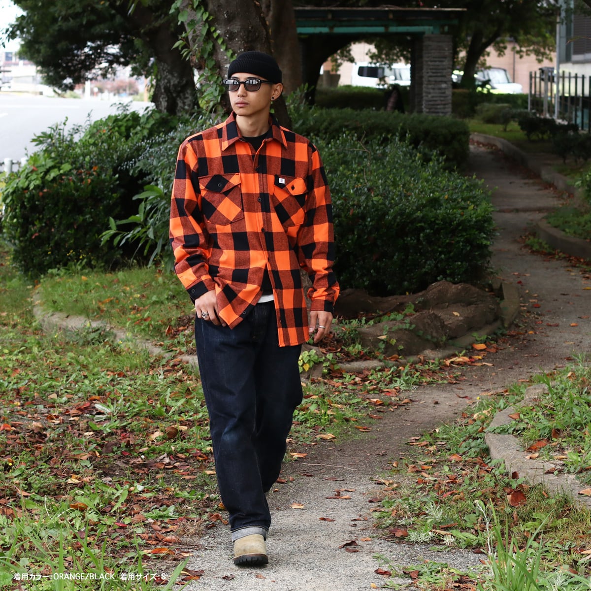 WHITE/BLKはサイズLの着用でした。厚手のネルシャツで生地が丈夫なので、作業着として使っていただくのはもちろん、普段使いでサラッと羽織るのにもおすすめです。Tシャツの上から1枚で着ても良いですし、冬の重ね着でもアクセントになる万能なシャツです。