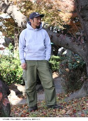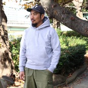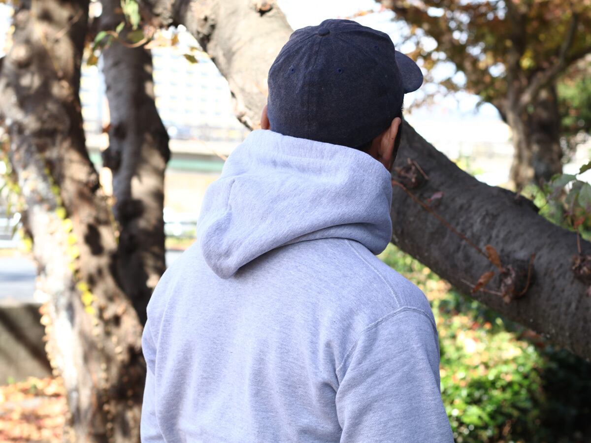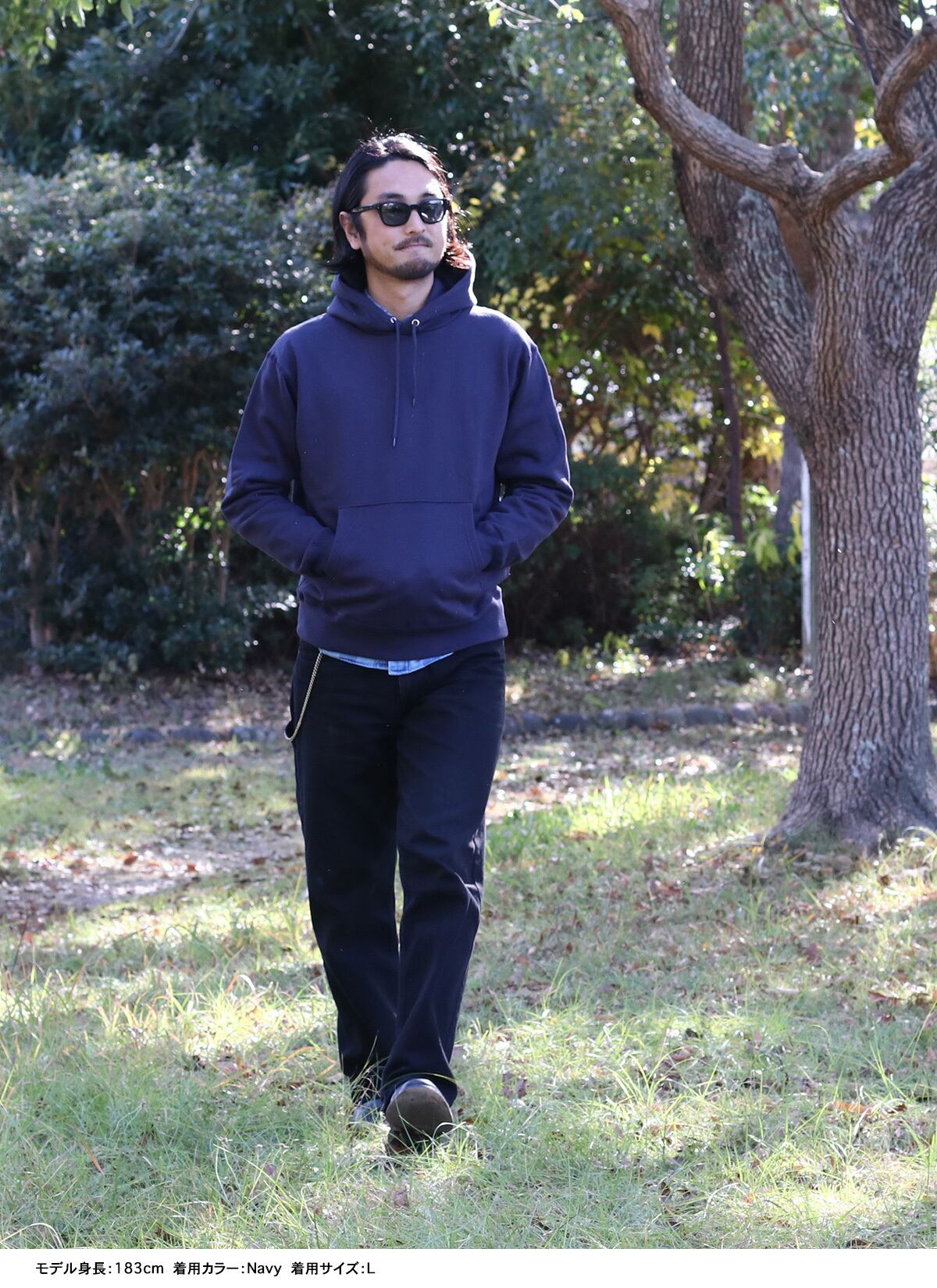 Lサイズの着用でした。程よいゆとりで個人的には丁度良いしっくりくるサイズ感です。生地はクルーネックタイプよりも厚い15.6ozなので、単体でもボリューム感のある一着となっております。