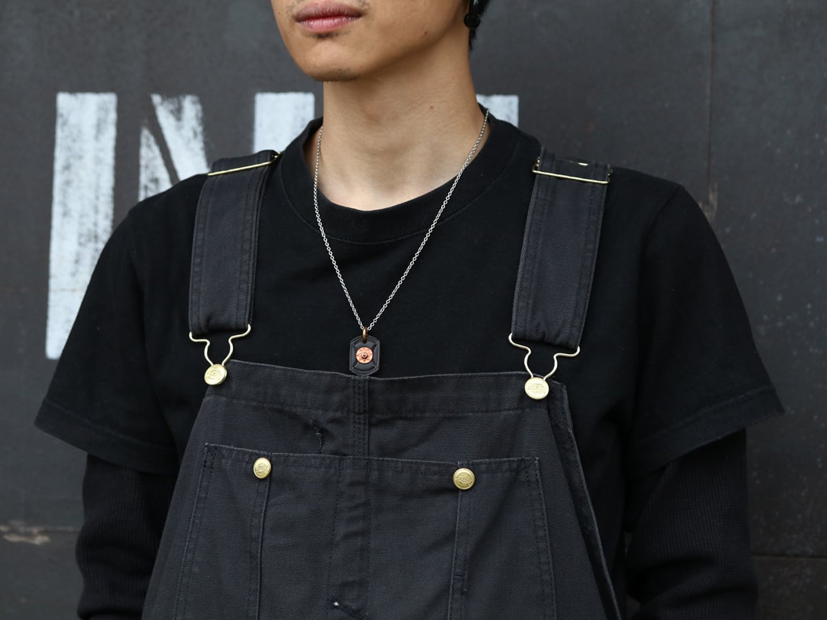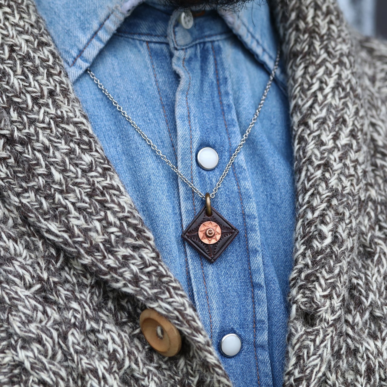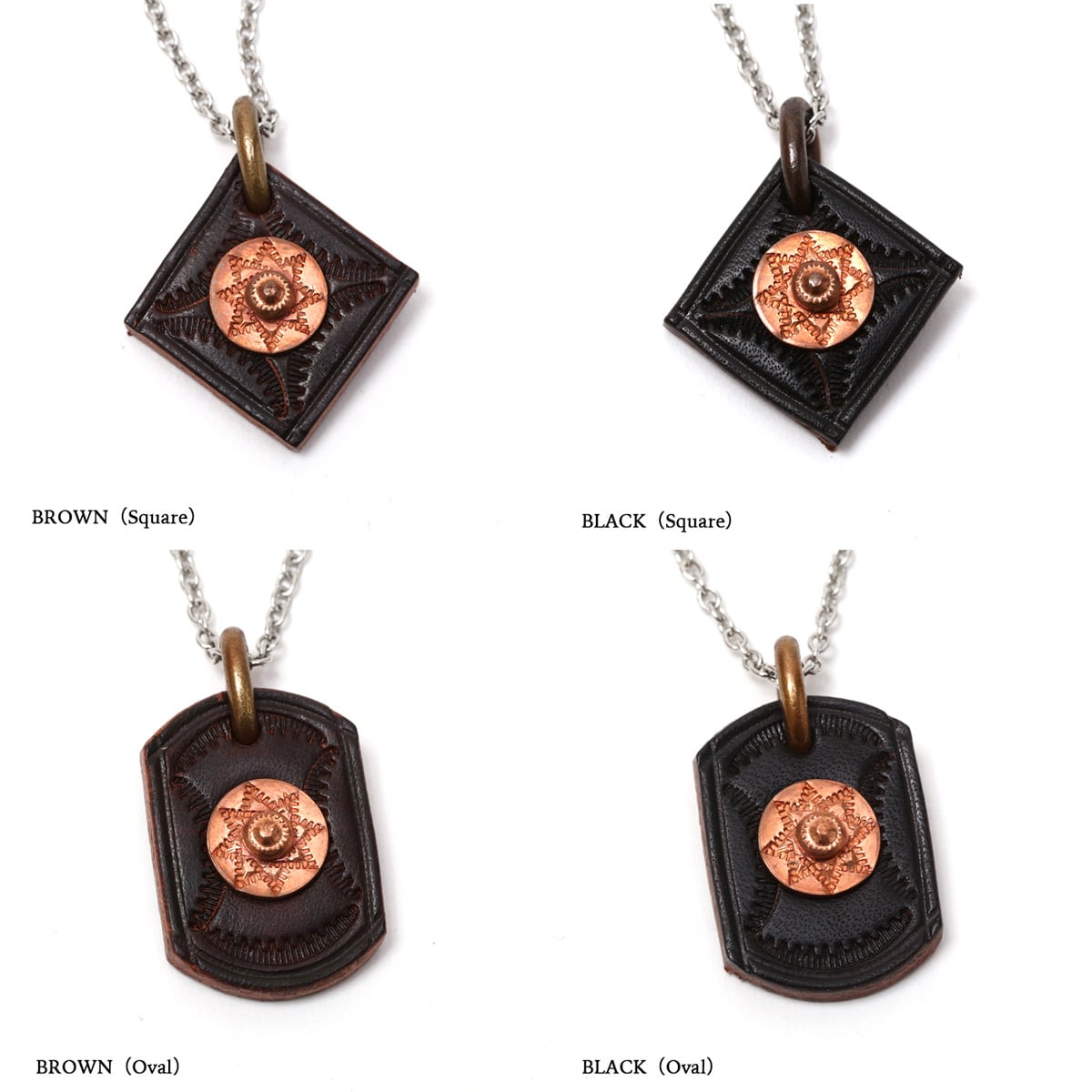 同ブランド新作のネックレス。重厚なレザーにオールドな雰囲気漂うスタンプワークが特徴。特筆すべきは米国産のカッパーリベットに手打ちで太陽をモチーフにしたデザインを打刻している点。部材に使用しているブラス(真鍮)金具も加工を施し独自の世界観を表現。長年ご愛用頂き経年変化を存分にお楽しみ下さい。