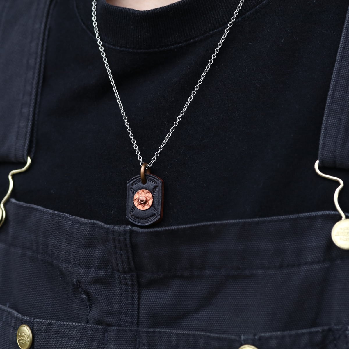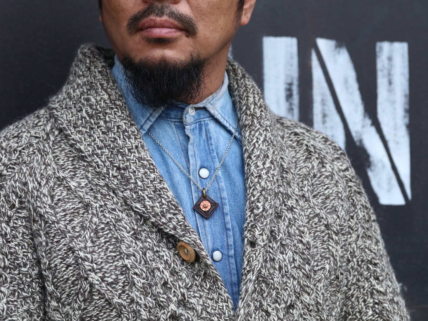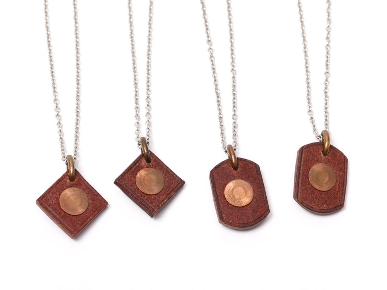 同ブランド新作のネックレス。重厚なレザーにオールドな雰囲気漂うスタンプワークが特徴。特筆すべきは米国産のカッパーリベットに手打ちで太陽をモチーフにしたデザインを打刻している点。部材に使用しているブラス(真鍮)金具も加工を施し独自の世界観を表現。長年ご愛用頂き経年変化を存分にお楽しみ下さい。