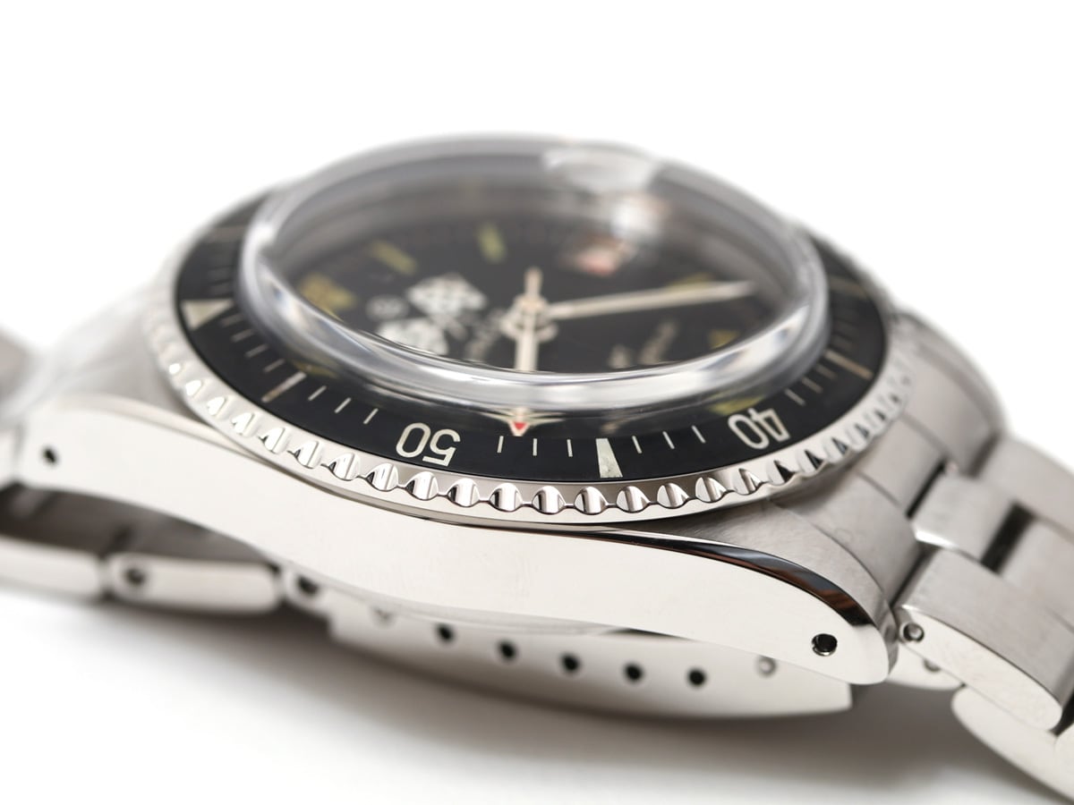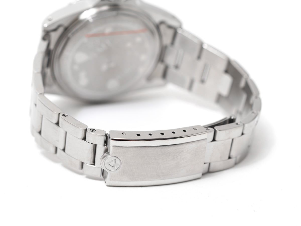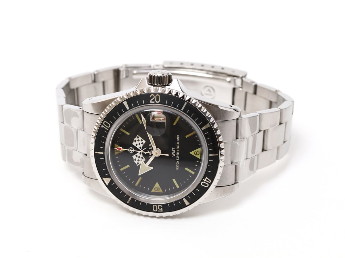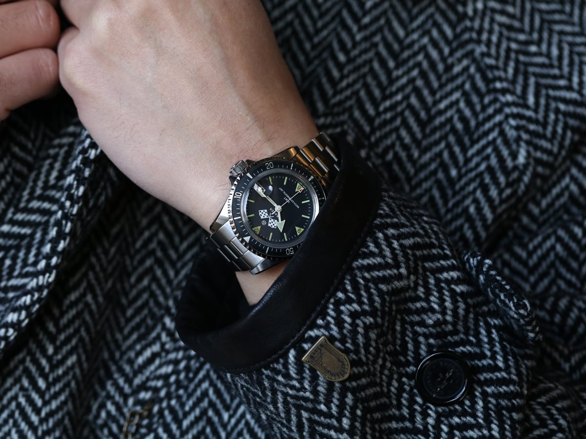 マットブラックのダイヤルには、象徴的なクロスレーシングフラッグが配され、伝統的なダイバーズとは一線を画す個性的な表情を演出。6・9・12時位置のトライアングルインデックスは初期MilSubのレイアウトを彷彿とさせ、視認性とシンメトリーを高めています。クリーミーな焼け感を再現したルミプロットとゴールドのアクセントが、エイジングされたトリチウムのような深みを与え、ヴィンテージの魅力を引き立てます。ルーレット式デイト表示と力強いアローハンドを組み合わせたこのモデルは、海の探検家にも、サーキットのレーサーにもふさわしい、冒険心あふれる一本です。