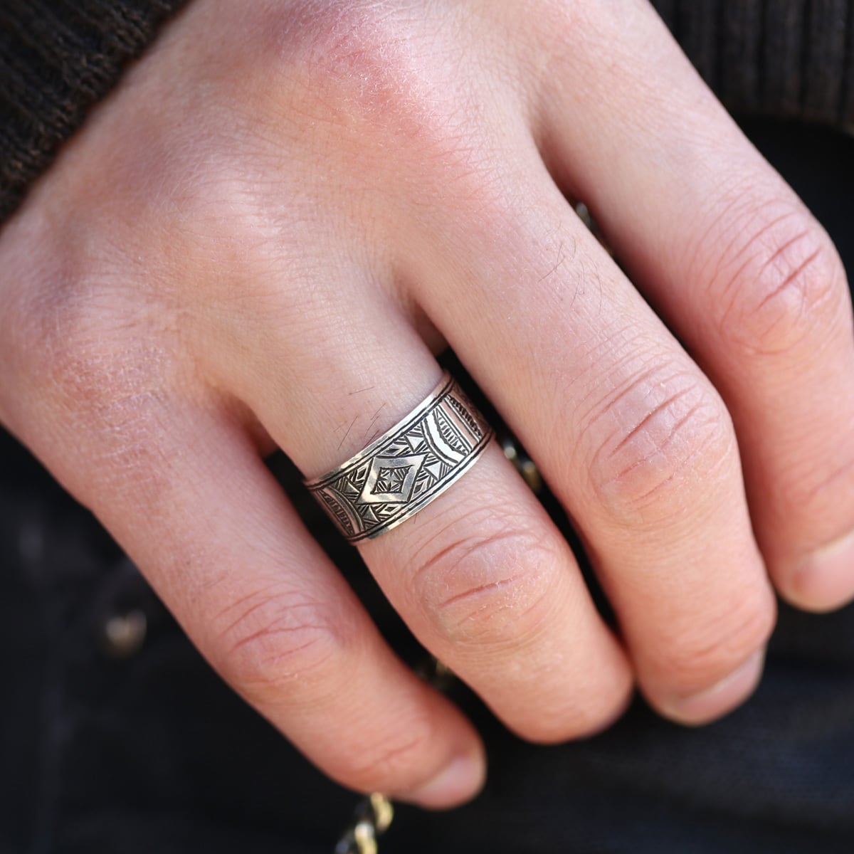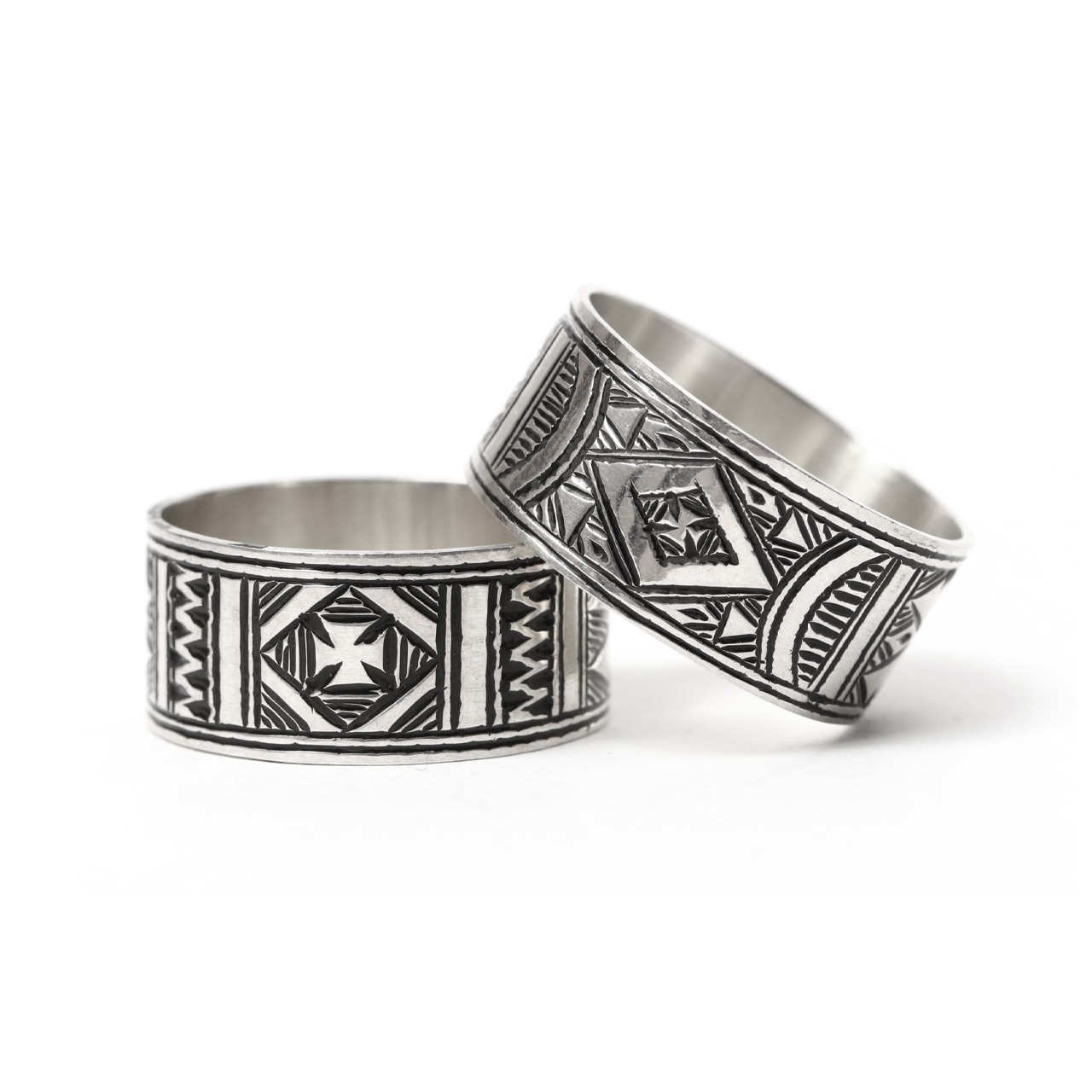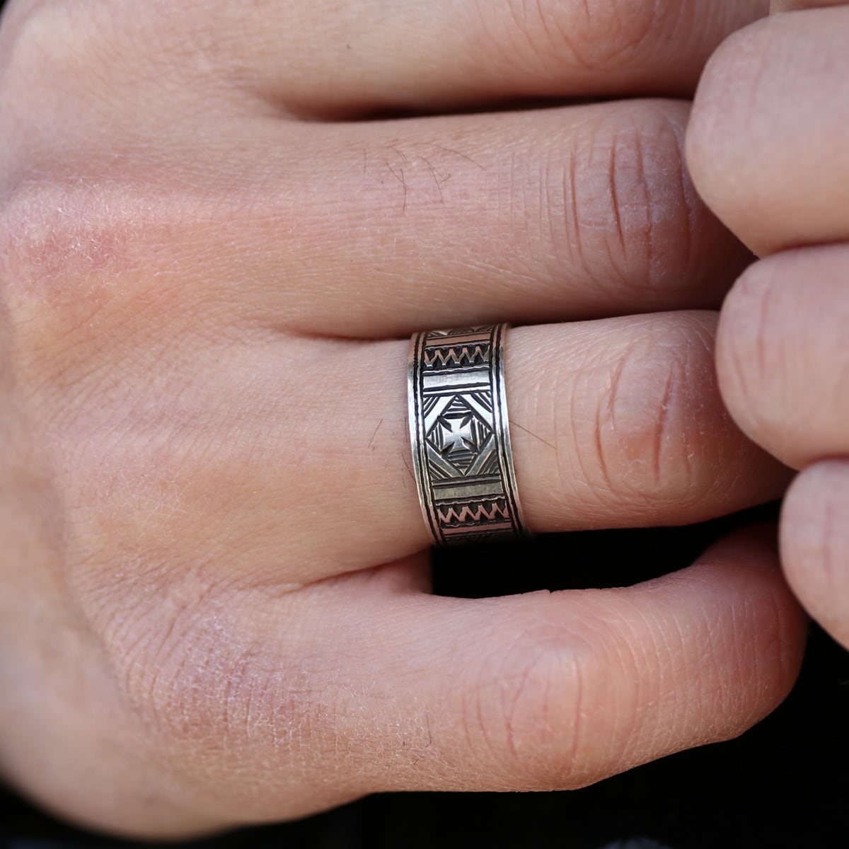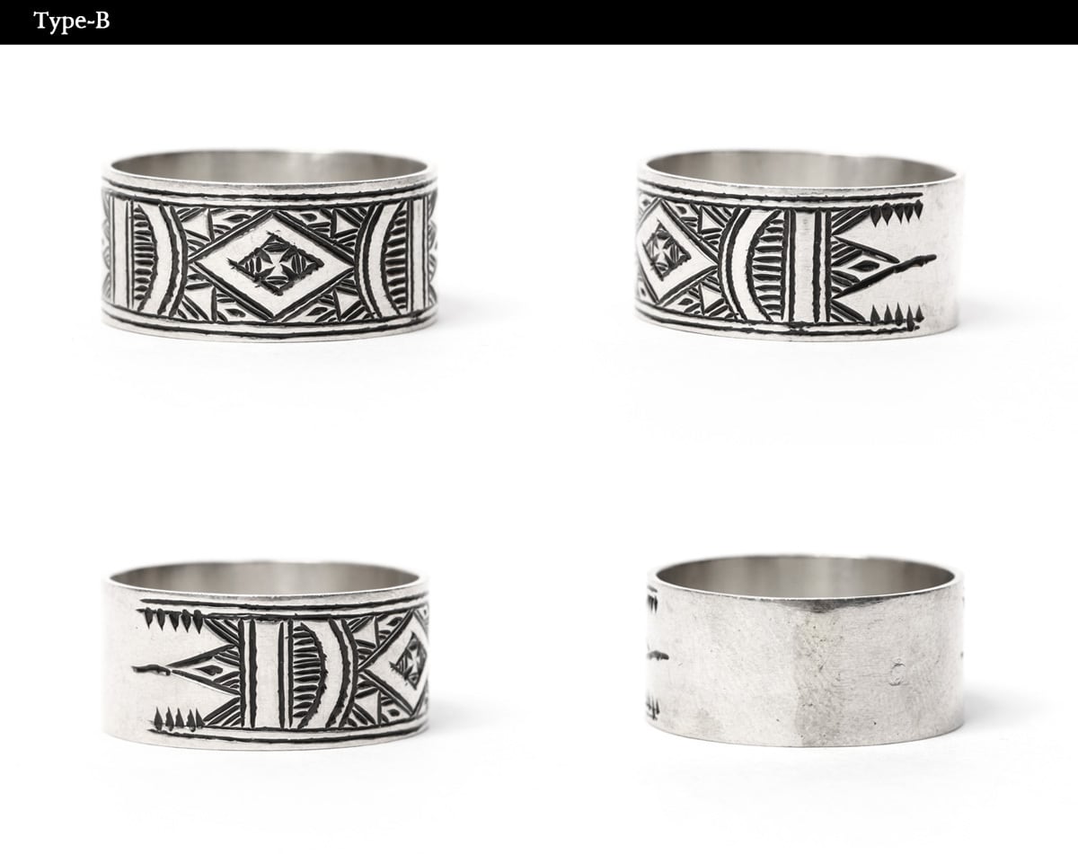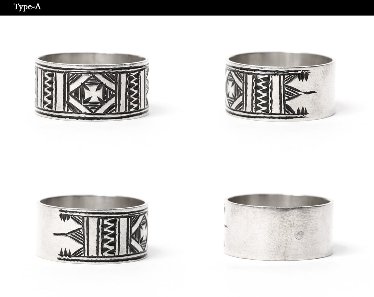 伝統的な民族柄を全て手作業で彫り込んだ作品。リング中央にアイアンクロスに似たパターンが印象的な作品。トゥアレグ族のジュエリーの模様には、家紋、戦への勝利のお守り、砂漠での道に迷わないための魔除け、交易の安全を願うお守りといった意味があります。贈り物としても最適なアイテムの1つです。