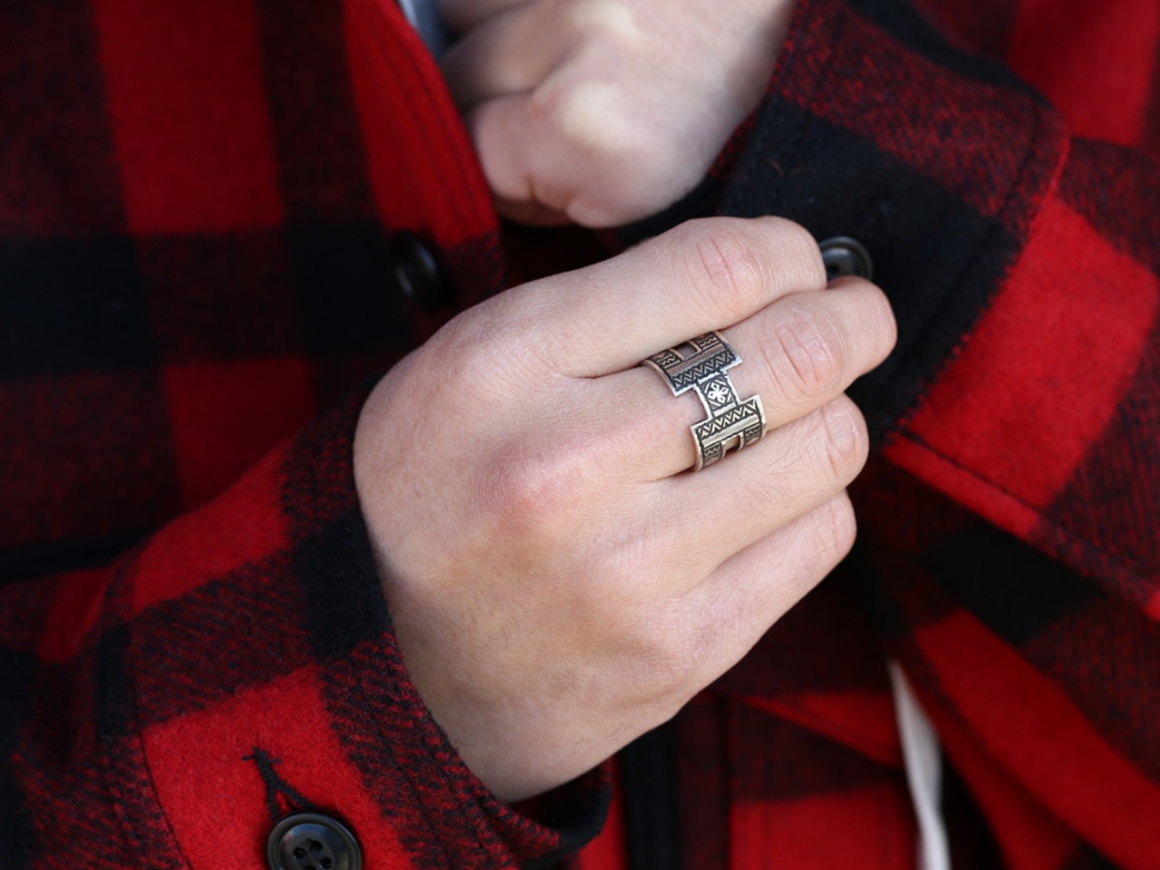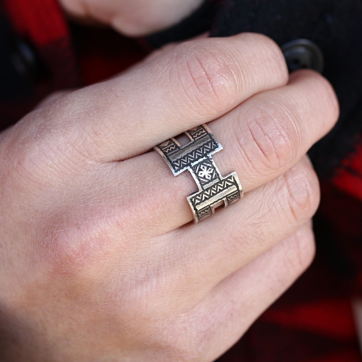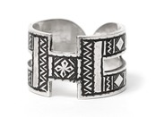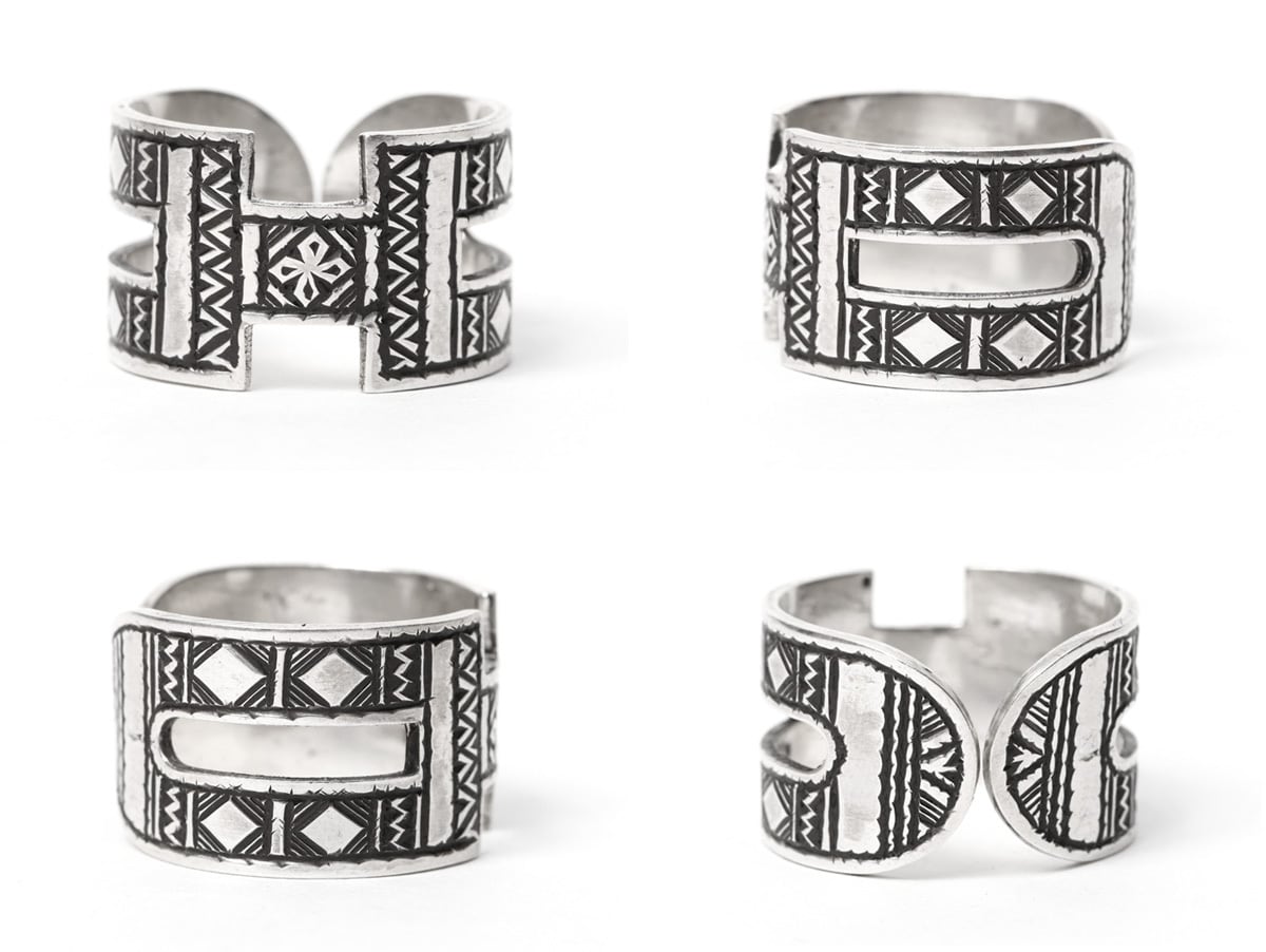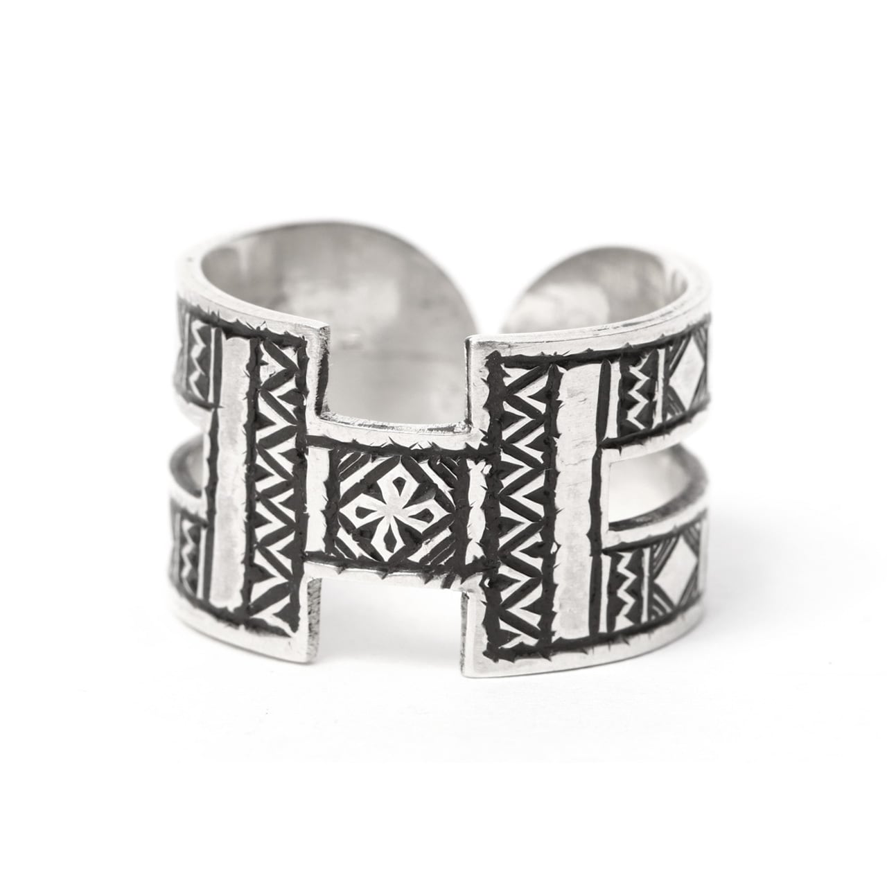 伝統的な民族柄を全て手作業で彫り込んだ作品。トゥアレグ族のジュエリーの模様には、家紋、戦への勝利のお守り、砂漠での道に迷わないための魔除け、交易の安全を願うお守りといった意味があります。アルファベットの“H”に似たデザインが印象的なリング。贈り物としても最適なアイテムの1つです。