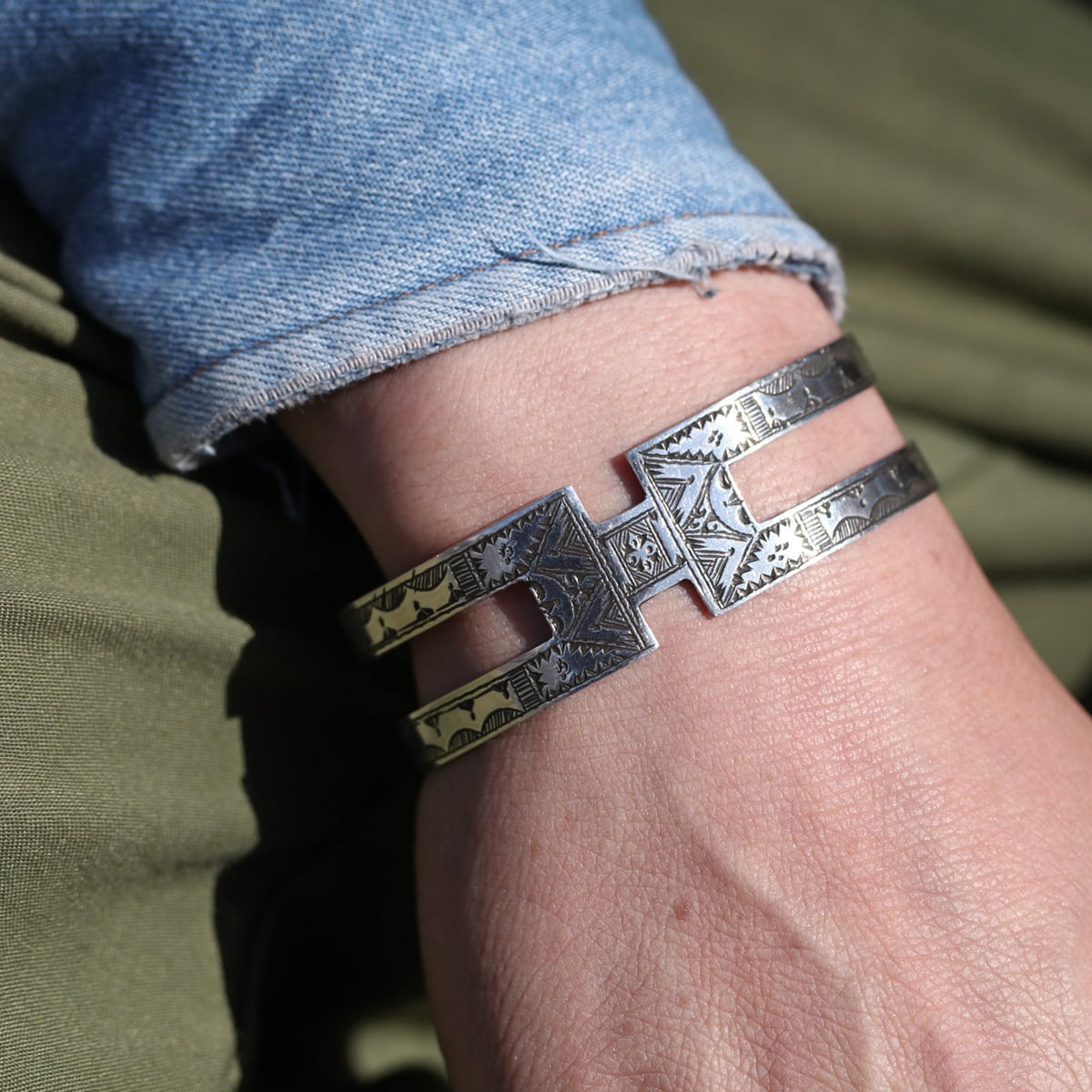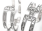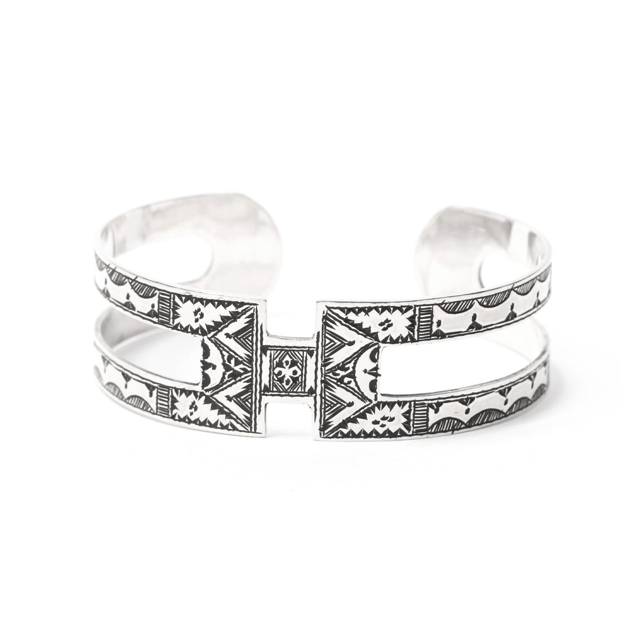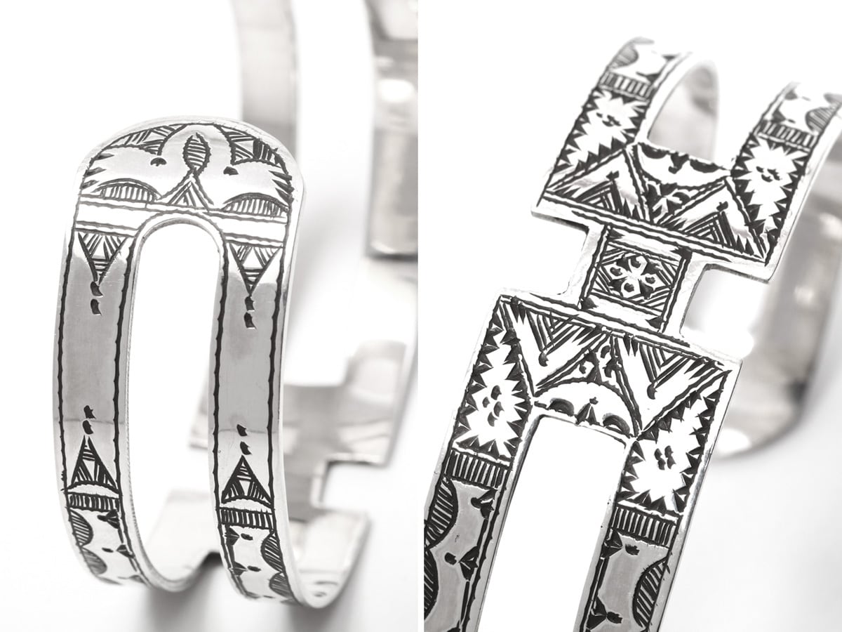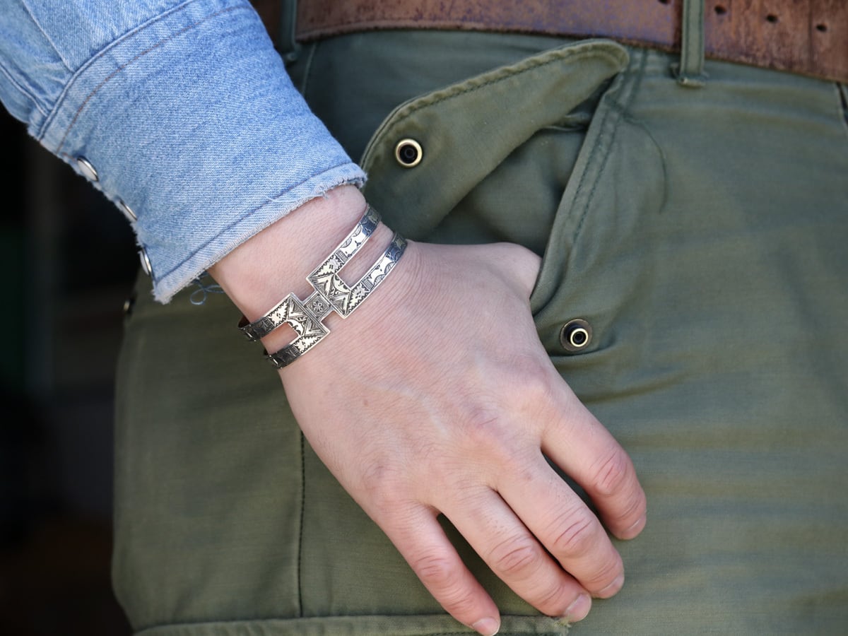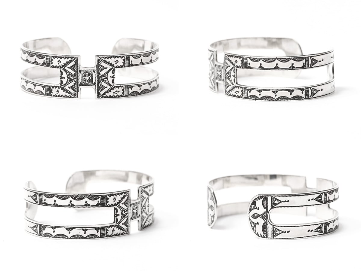 伝統的な民族柄を全て手作業で彫り込んだ作品。バングルの中央部分がアルファベットの“H”に似たデザインが印象的な1本。トゥアレグ族のジュエリーの模様には、家紋、戦への勝利のお守り、砂漠での道に迷わないための魔除け、交易の安全を願うお守りといった意味があります。シンプルなデザインで年齢や性別を問わずお楽しみ頂けるアイテムです。