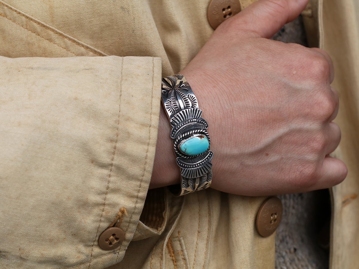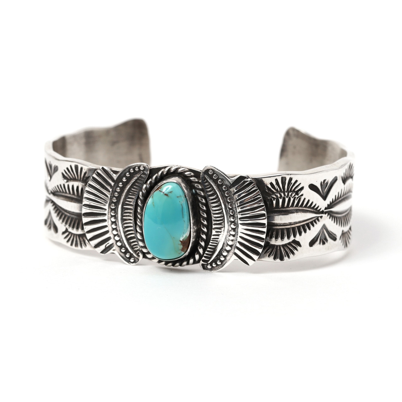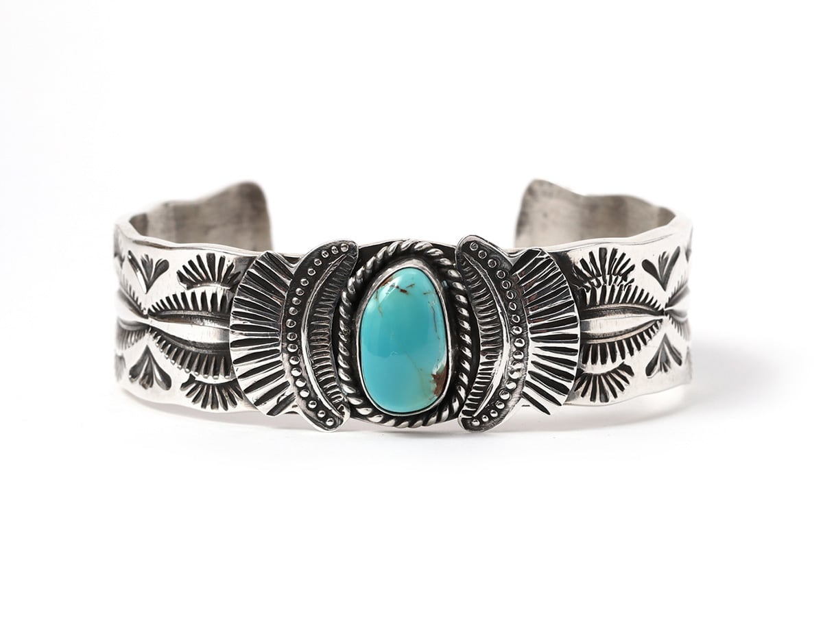 重厚なシルバーと美しいターコイズが特徴のカフバングルです。センターに大粒のキングマンターコイズを配置し、その周囲を「サンレイ(太陽の光)」を思わせる扇形のスタンプワークが彩っています。バンド部分には「フェンススタンプ」と呼ばれる伝統的な幾何学模様が刻まれており、ナバホジュエリーらしい力強さと繊細さが共存しています。