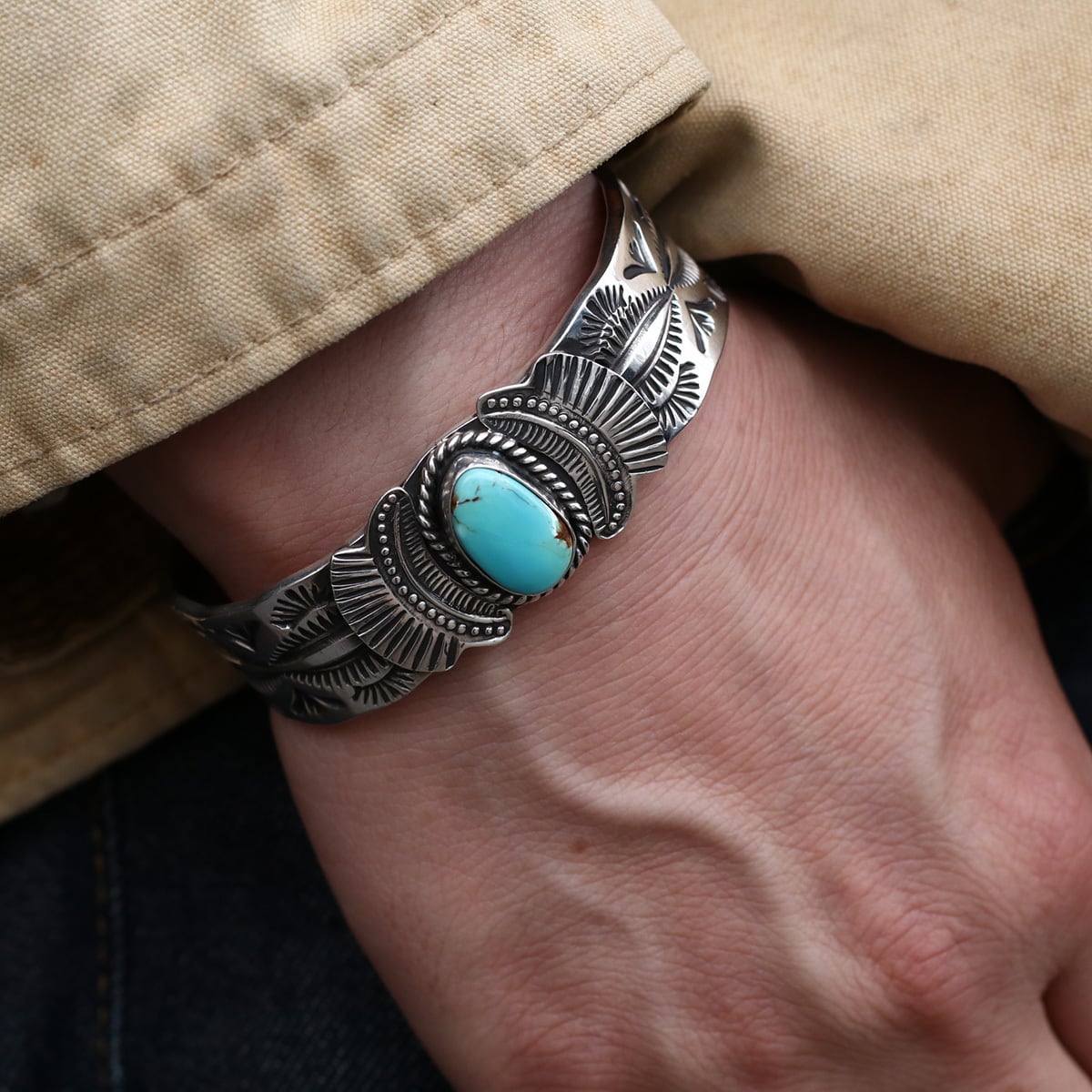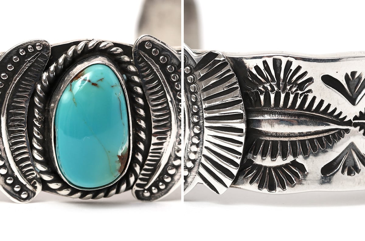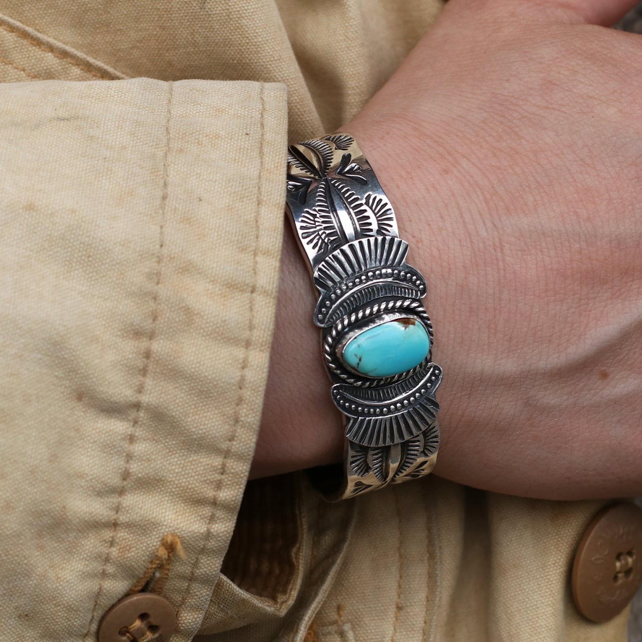 重厚なシルバーと美しいターコイズが特徴のカフバングルです。センターに大粒のキングマンターコイズを配置し、その周囲を「サンレイ(太陽の光)」を思わせる扇形のスタンプワークが彩っています。バンド部分には「フェンススタンプ」と呼ばれる伝統的な幾何学模様が刻まれており、ナバホジュエリーらしい力強さと繊細さが共存しています。