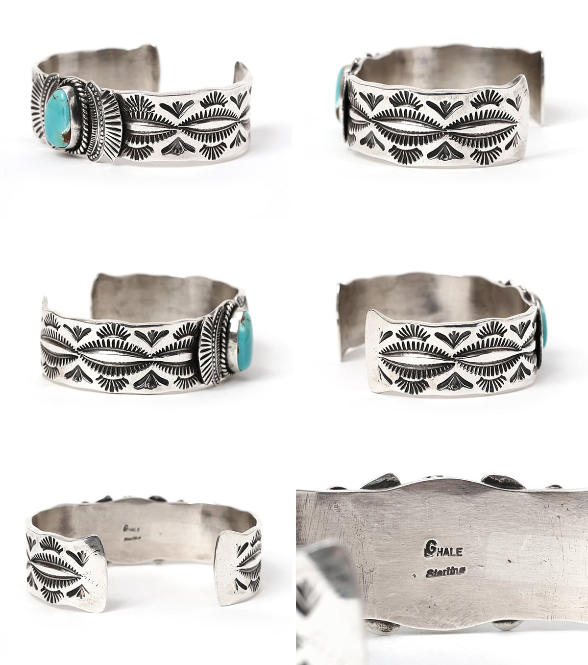 ナバホ族のシルバースミスであるGarrett Hale(ギャレット・ヘイル)は、伝統的な意匠と重厚な作風で知られるネイティブアメリカン・ジュエリーのアーティストです。彼の作品の最大の特徴は、厚みのあるスターリングシルバーに自作のタガネで緻密な模様を刻み込む、力強いスタンプワークにあります。特に「イーグルダンサー」や「サンフェイス」といったカチナ(精霊)をモチーフにした大型のボロタイや、高品質なターコイズを贅沢にあしらったカフ・ブレスレットが代表的です。伝統を忠実に継承しながらも、一目で彼のものと分かる独特の造形美を備えた作品は、ニューメキシコ州の権威あるギャラリーでも高く評価されており、本格的なネイティブアメリカン・アートのコレクターから厚い信頼を寄せられています。