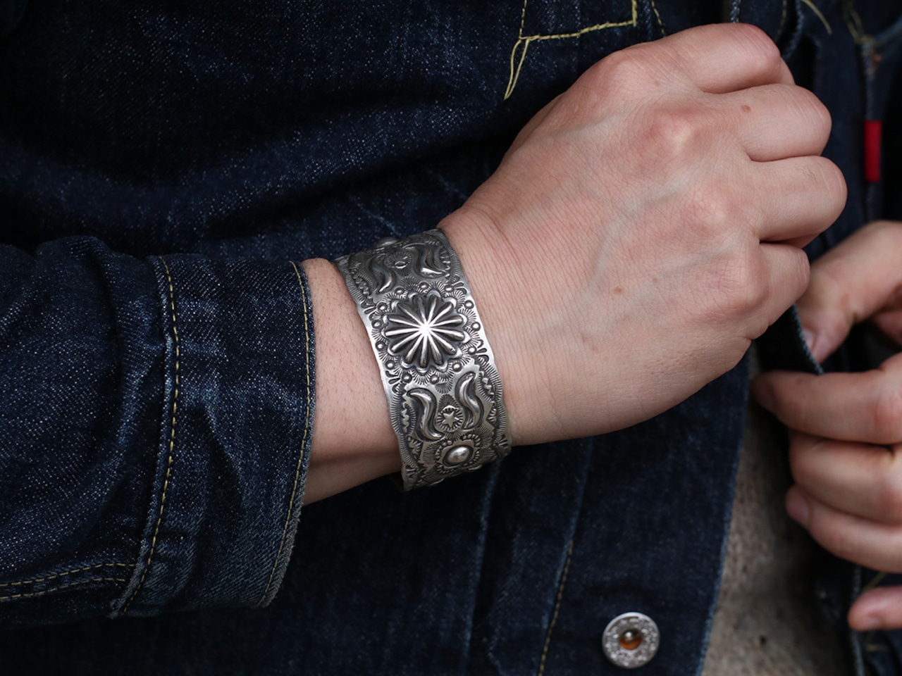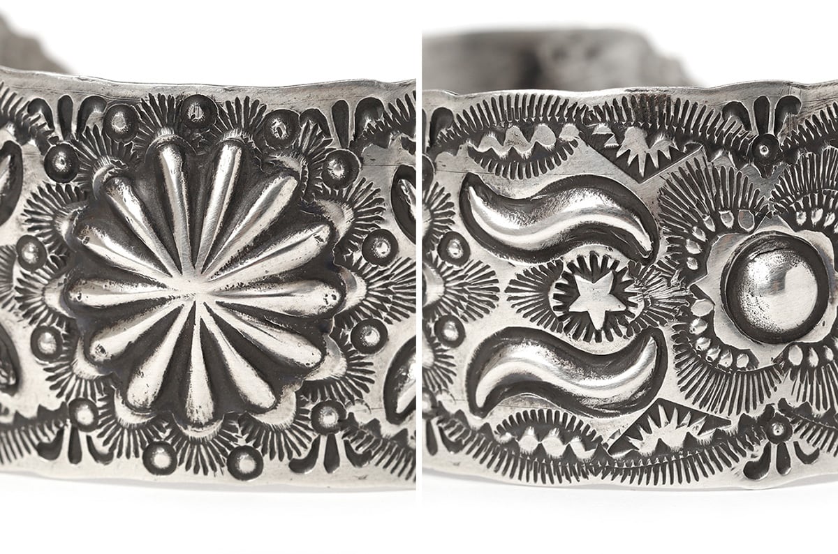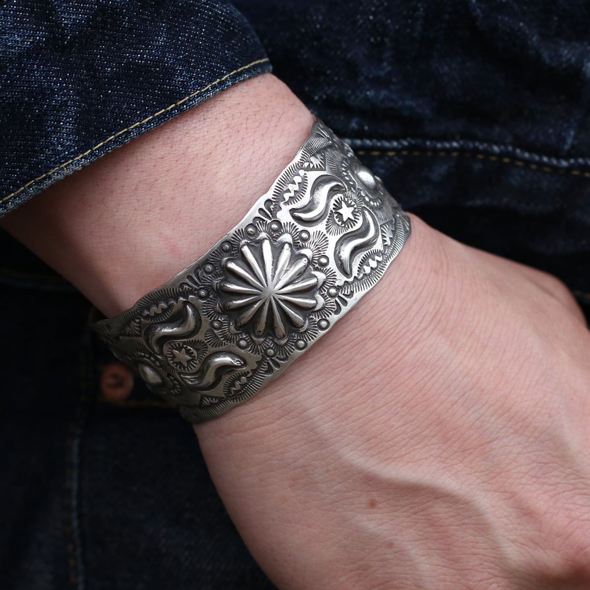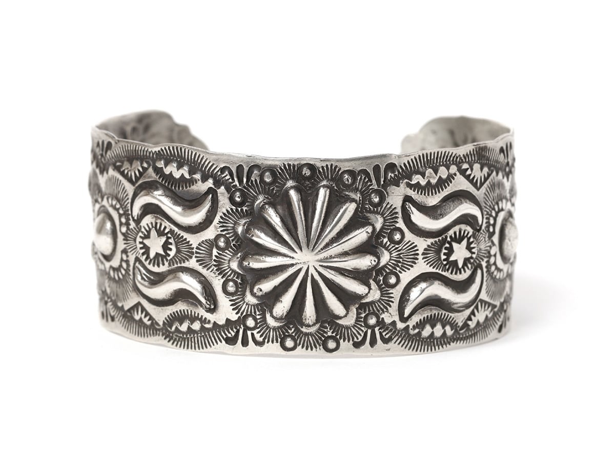燻んだシルバーに大胆なモチーフを得意とし、クラシカルなスタンプワークが人気です。ナバホ族にとって強い力と癒しの象徴であるサンバーストをメインに大小様々なスタンプワークが打たれています。存在感があり、男女ともにおすすめです。