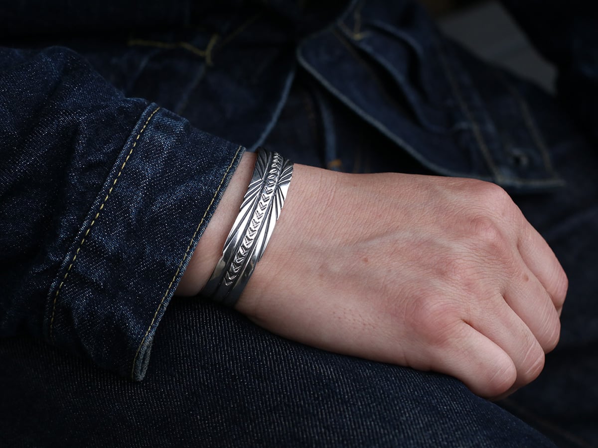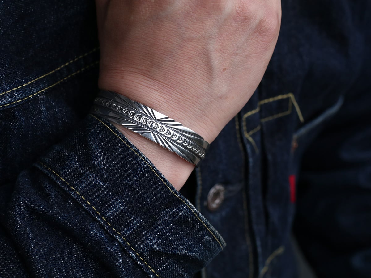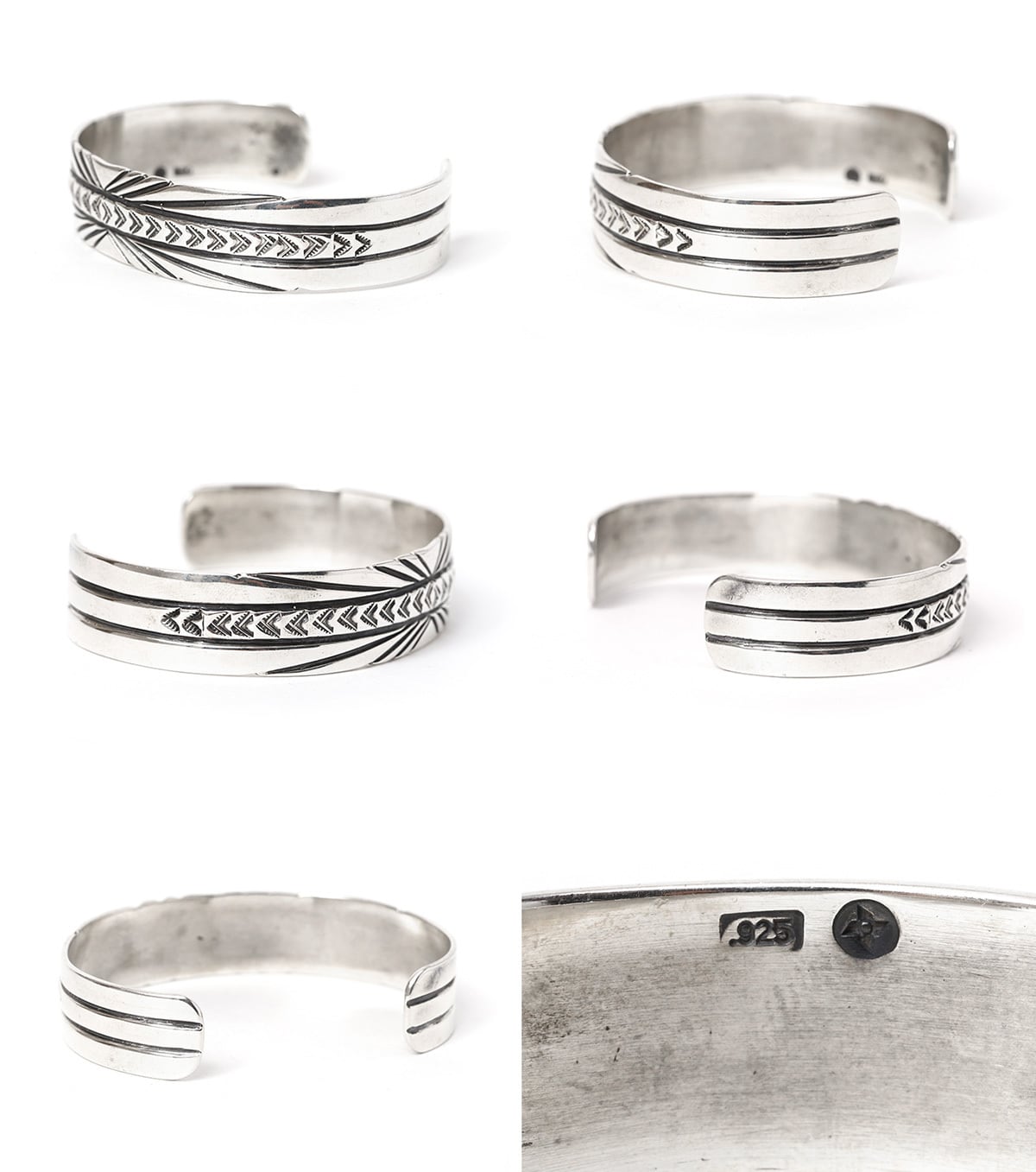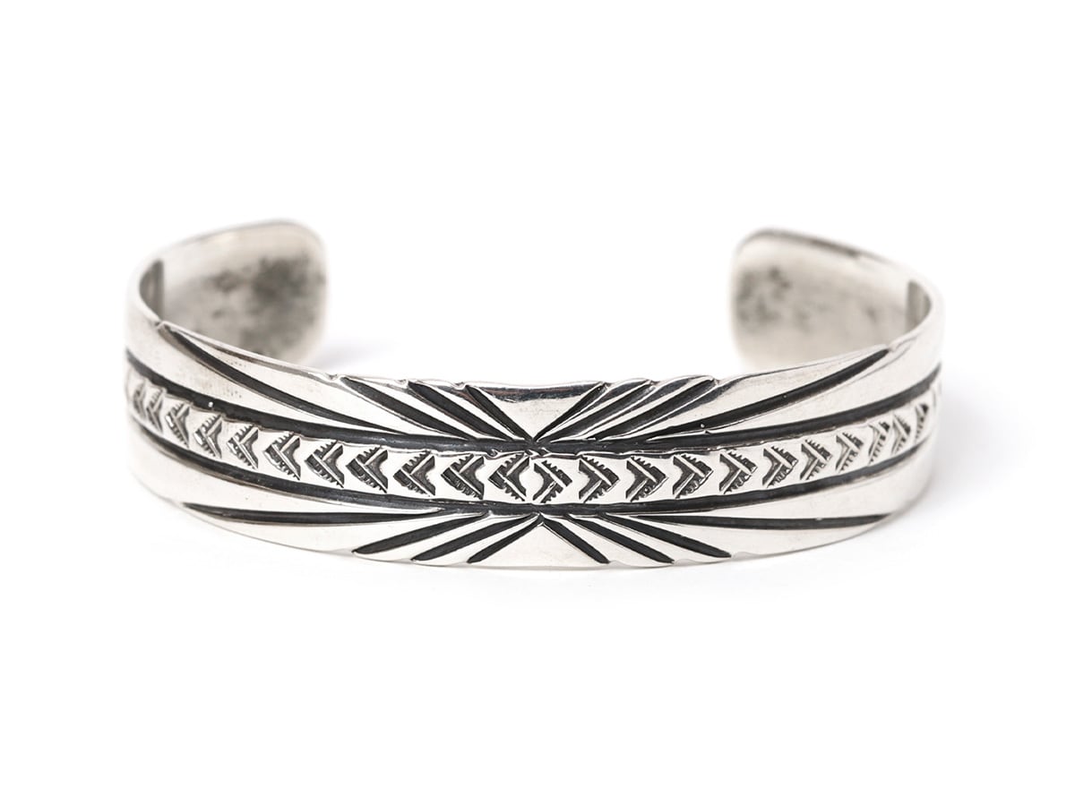 サンバーストのワイルドなナバホ族らしいジュエリーです。少し幅広なサイズとワイルドなスタンプワークのデザインが腕を華やかにしてくれます。太陽の輝きをぜひ。