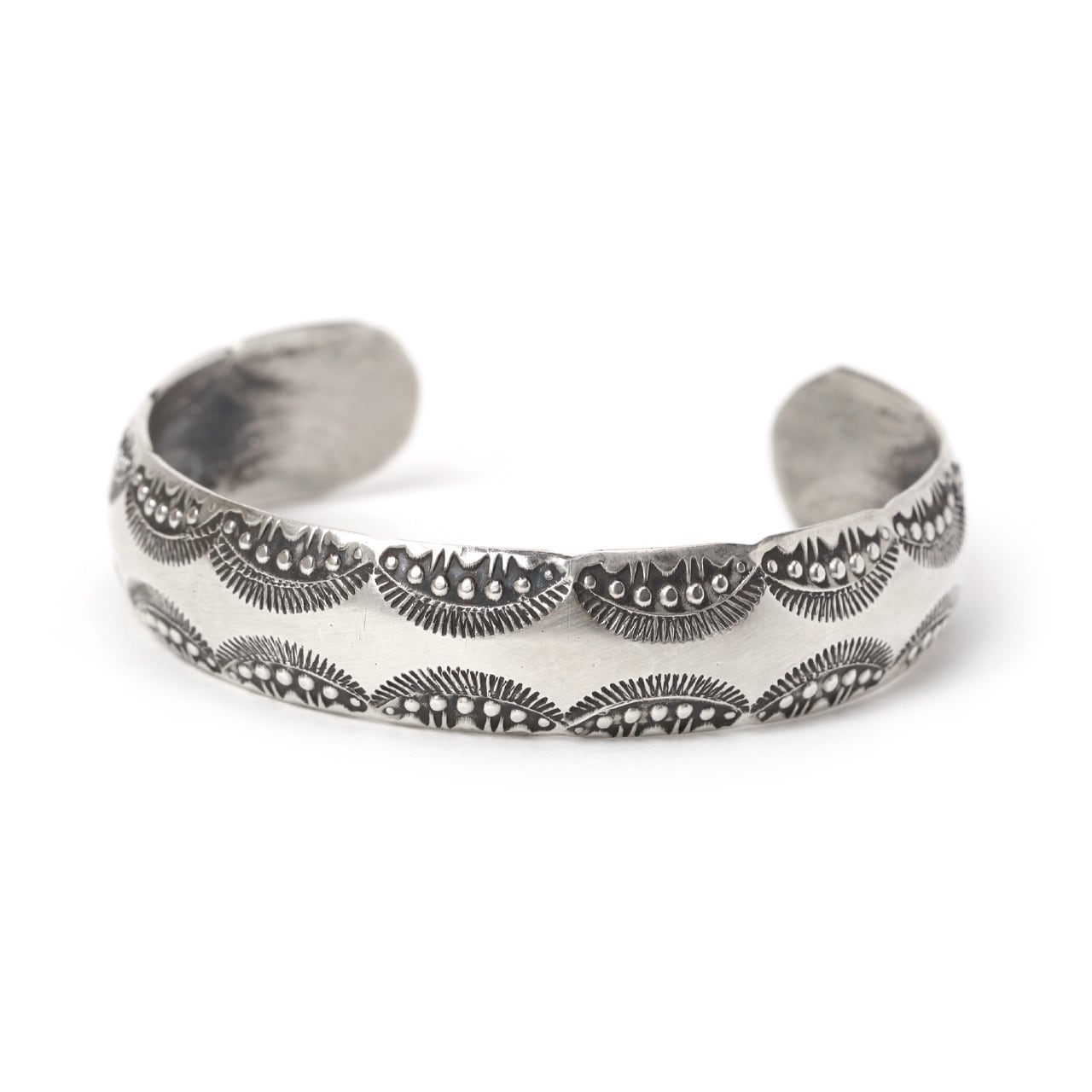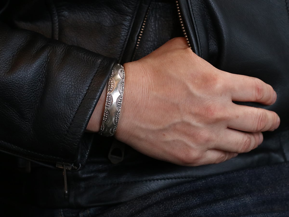 丸みがあるドーム型にスタンプワークが施されたデザインがどんなスタイルにも合わせやすいバングルに仕上がっています。重ね付けにも丁度良いデザインです。