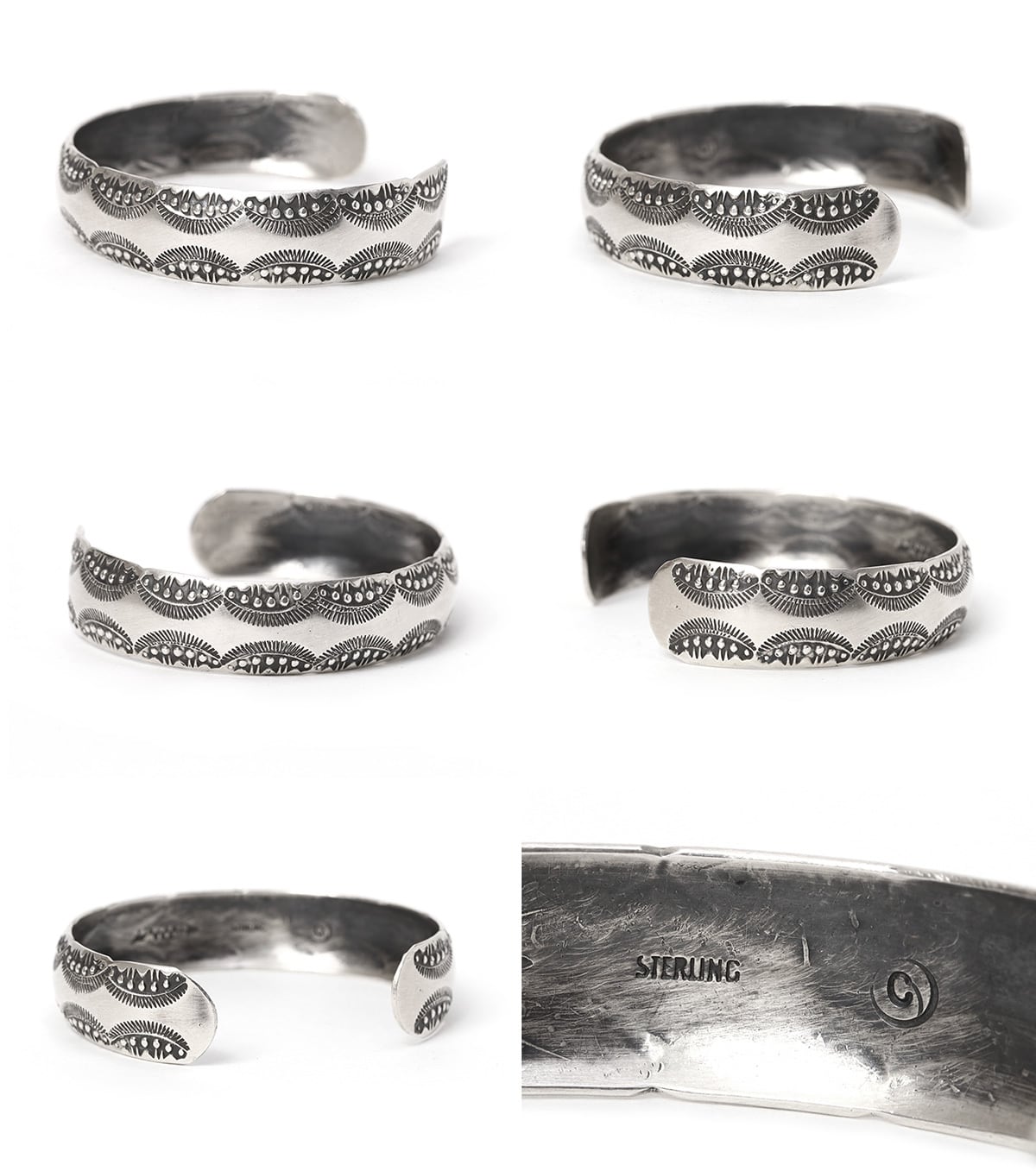 ナバホ族のマスター・シルバースミスであるVincent J. Platero(ヴィンセント・プラテロ)は、1957年にニューメキシコ州で生まれ、母から受け継いだ伝統技法を現代的な感性で昇華させたアーティストです。彼の代名詞は、自作の鋼鉄製スタンプを何十種類も組み合わせ、シルバーの表面を緻密な模様で埋め尽くす重厚なスタンプワークにあります。特にナバホ族の伝統的な織物(ラグ)の幾何学模様を銀細工に落とし込むスタイルを得意とし、石を一切使わずシルバーの陰影と造形だけで表現する独自の美学を貫いています。蝶やトンボといった自然界のモチーフを力強く刻み込んだ彼のジュエリーは、一つひとつが手作業で作られるため同じものが二つと存在せず、裏面に刻まれた「VJP」のサインとともに、世界中のコレクターから高い評価を受けています。