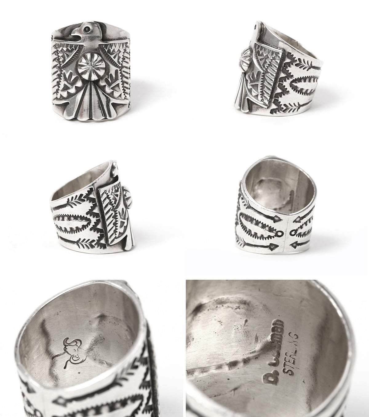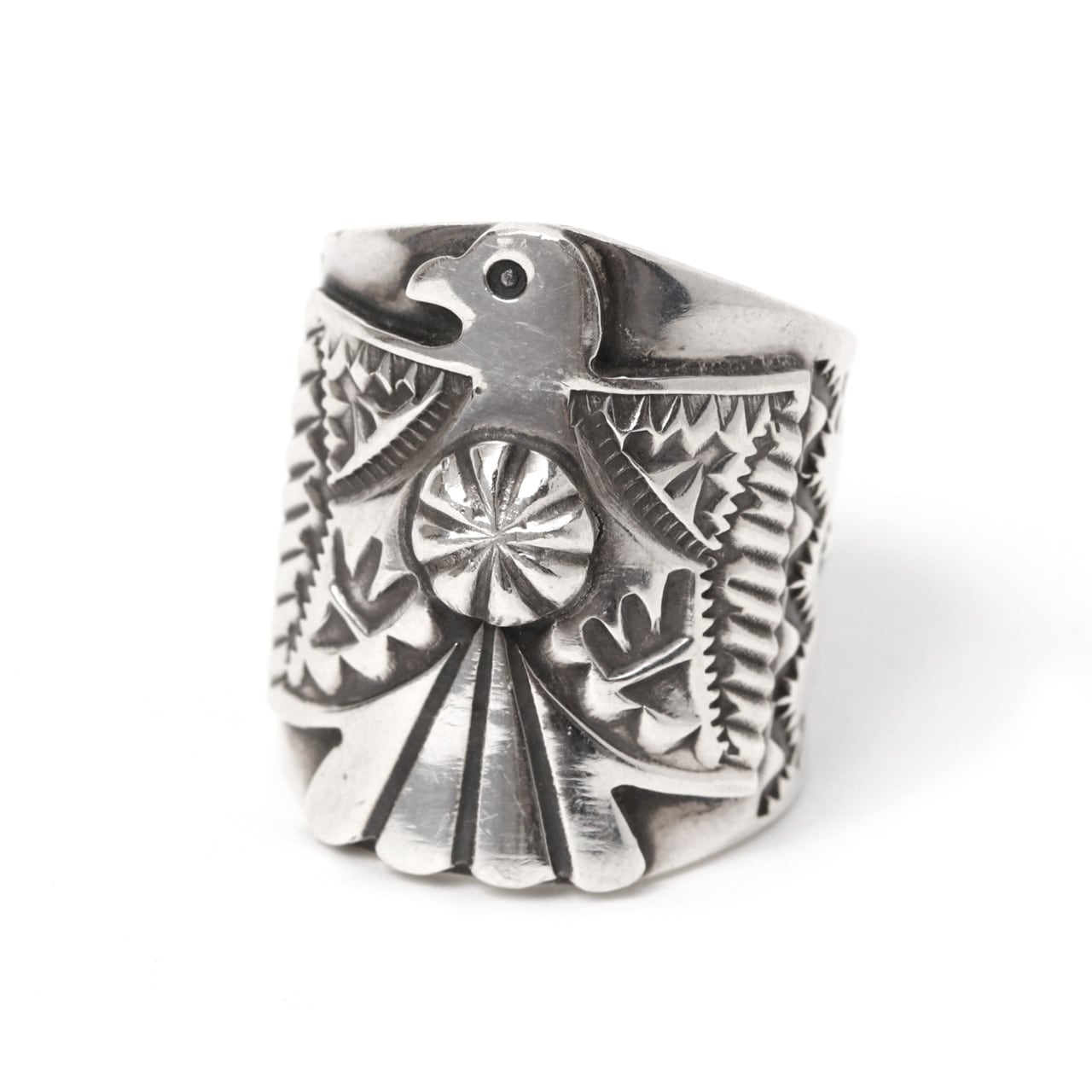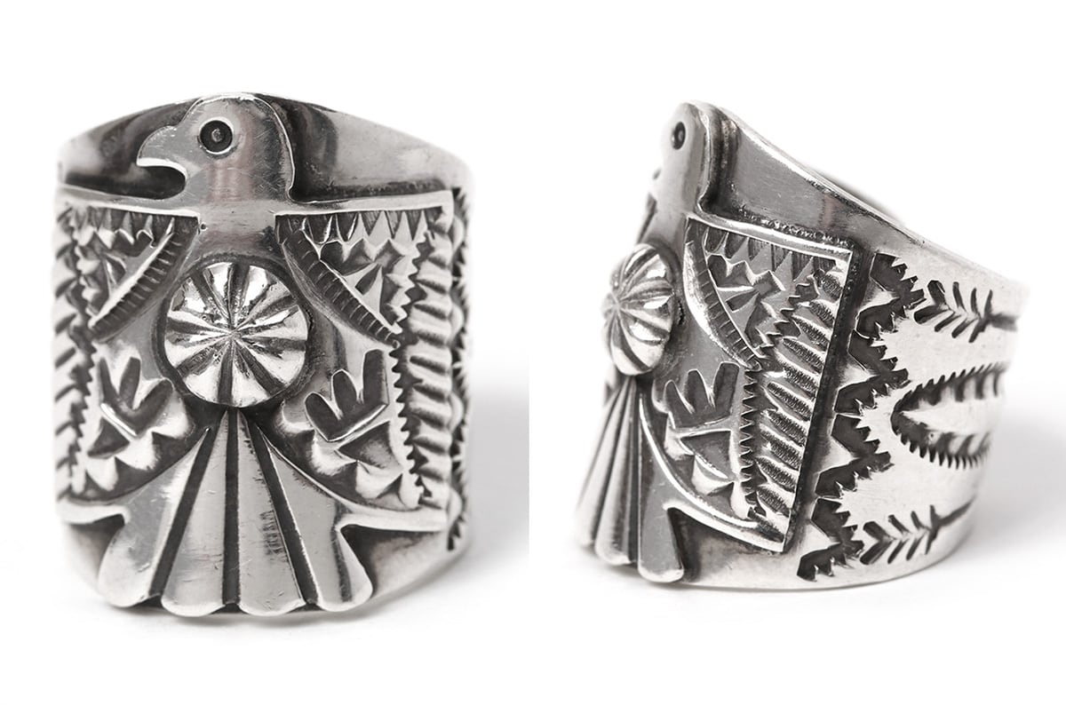 サンダーバードを象徴的に配し、緻密なスタンプワークが施されたこのワイドバンドリングは、ネイティブアメリカンジュエリー特有の力強さと職人技が光る、指先を主役級に彩る逸品です。