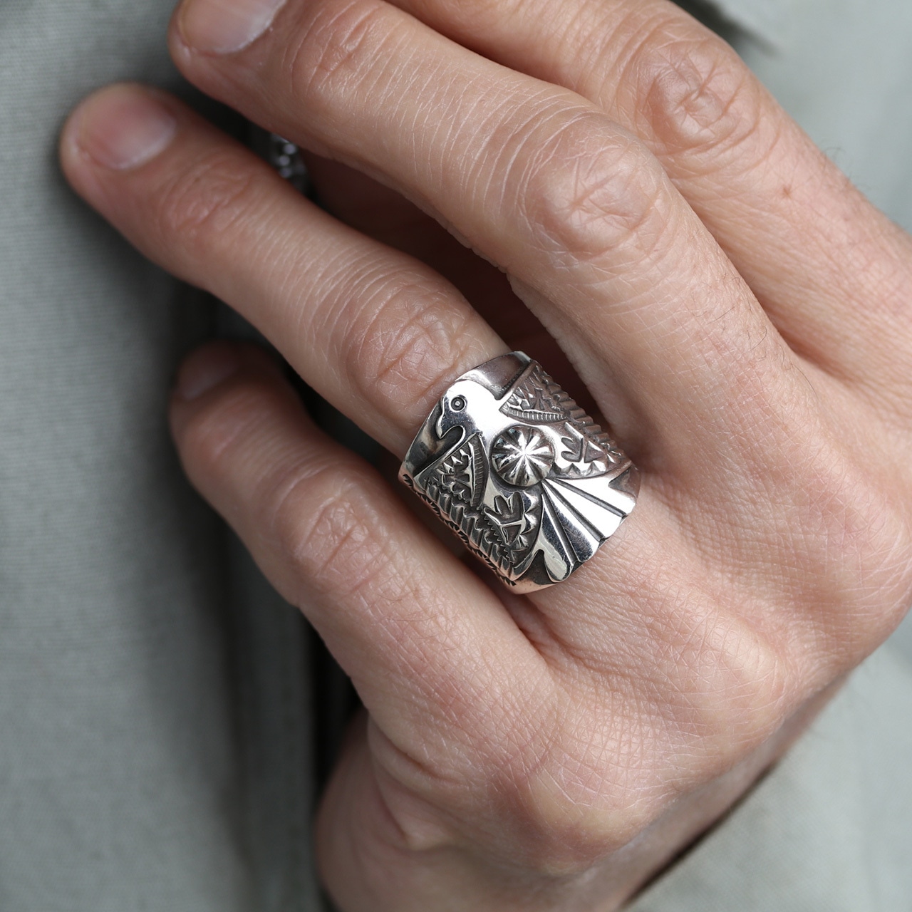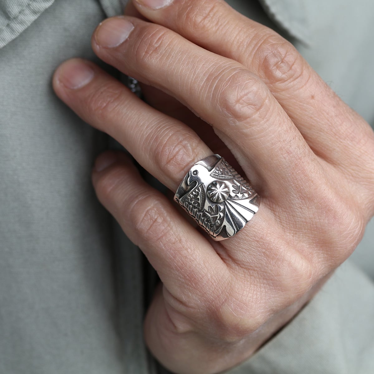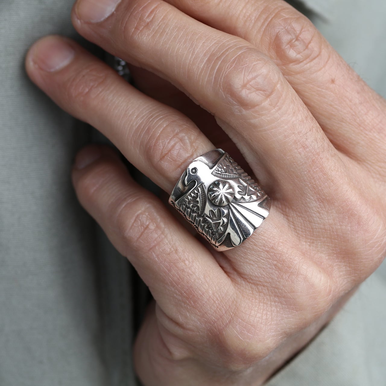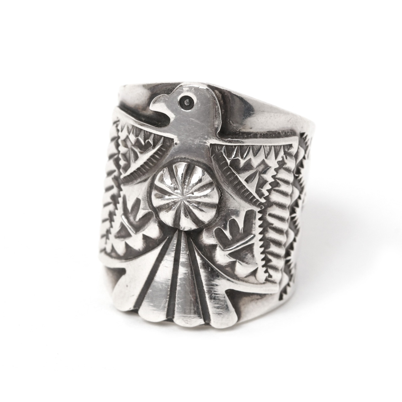 中央のサンダーバードの姿に不思議と背筋が伸びるような、そんな頼もしさを感じるリングです。幅広でしっかりとした存在感がありながら、細やかなスタンプワークから職人さんの温かな手仕事が伝わってきます。シルバーの清々しい輝きが、武骨さの中にどこか優雅な気品があり、これから時を重ねるほどに、もっと自分だけの特別な表情に育っていくのが楽しみになるような、深い魅力に溢れたリングです。