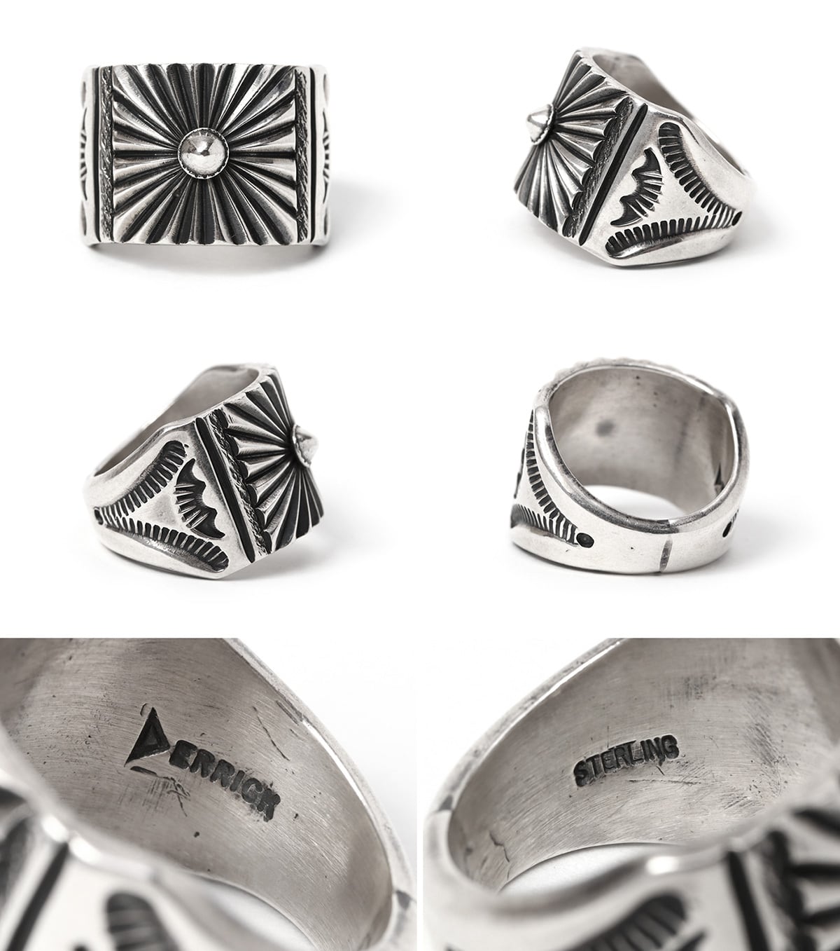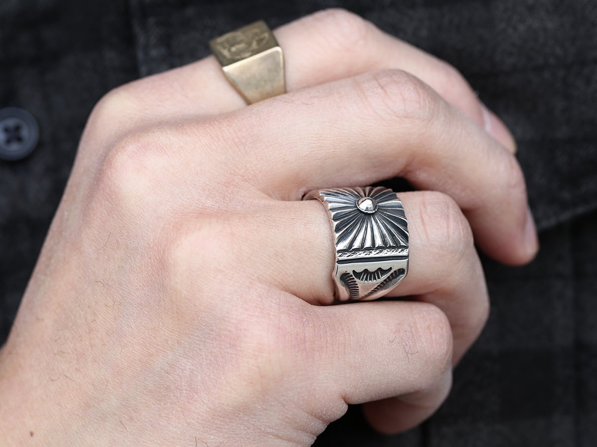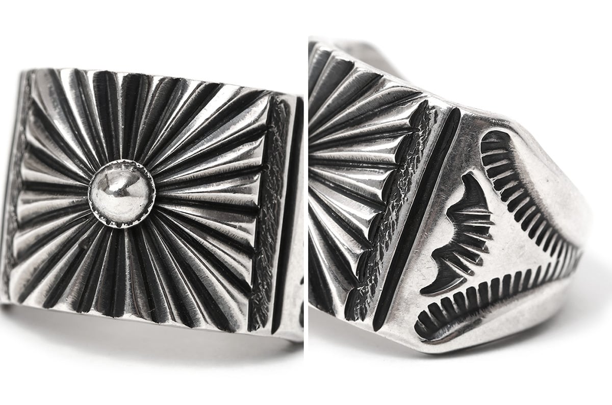 ナバホ族の熟練職人、デリック・ゴードン氏の卓越した技術が凝縮されたワイドシルバーリングです。中央に配置された立体的なリポウズ(叩き出し)を起点として、放射状に広がる「サンフェード(太陽の光)」のスタンプワークが、指元にダイナミックな躍動感と生命力を与えます。