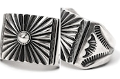 ナバホ族の伝統的なジュエリー製作において、いまや欠かせない存在となった熟練アーティスト、デリック・ゴードン氏。彼は叔父である名匠デルバート・ゴードン氏から技術を学び、その卓越した才能を開花させました。彼の作品の最大の魅力は、迷いのない一打から生み出される「深く、正確なスタンプワーク」にあります。特に、中央のリポウズ(叩き出し)から放射状に光が伸びる「サンフェード」の技法は、彼の代名詞とも言える意匠です。どっしりとしたシルバーの厚みが生む武骨な重厚感と、計算し尽くされた緻密なデザインによる洗練された美しさ。その絶妙なバランスが生み出す圧倒的な存在感は、ネイティブジュエリー愛好家のみならず、世界中のヴィンテージファンから高い評価と信頼を得ています。