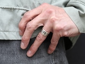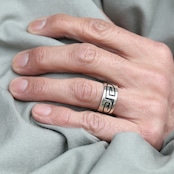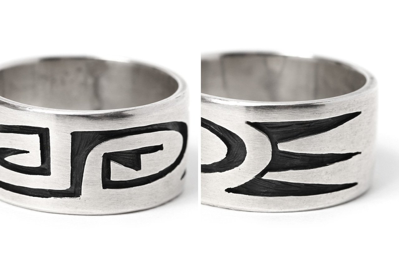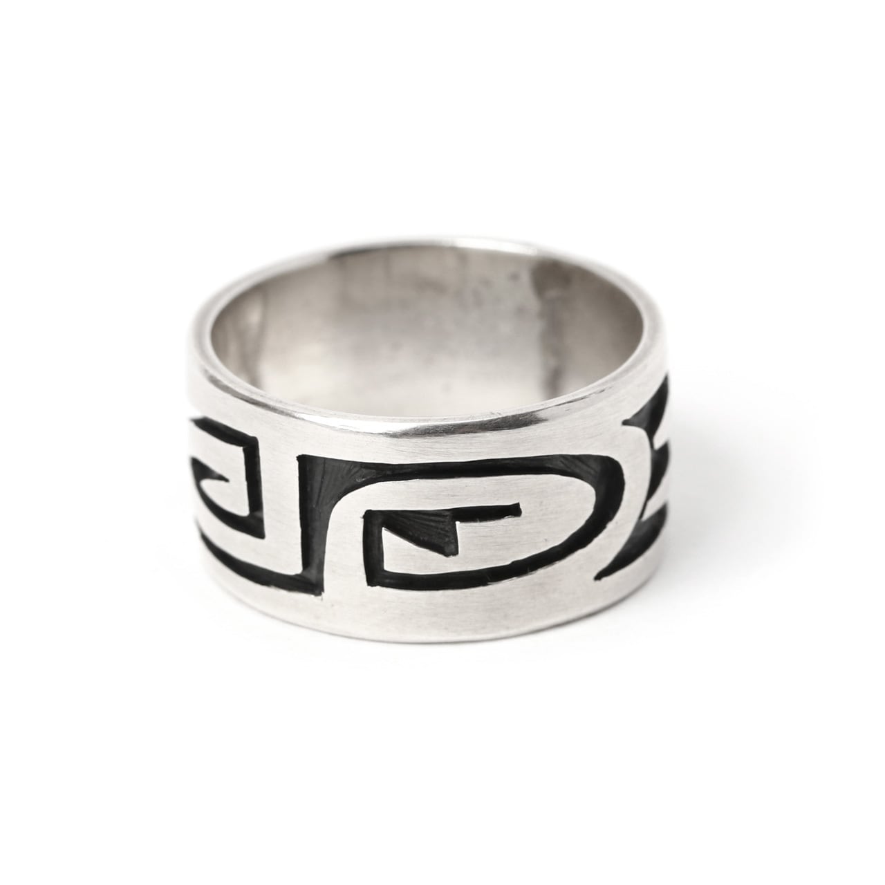 漆黒のいぶし加工とシルバーの光沢が、力強い幾何学模様を鮮やかに浮き上がらせています。伝統的なオーバーレイ技法を彷彿とさせつつも、無駄のない洗練された佇まいは、現代の装いにも調和するデザインです。武骨さと上品さを兼ね備え、指先に添えるだけで持ち主のこだわりを感じさせてくれる、完成度の高い逸品です。