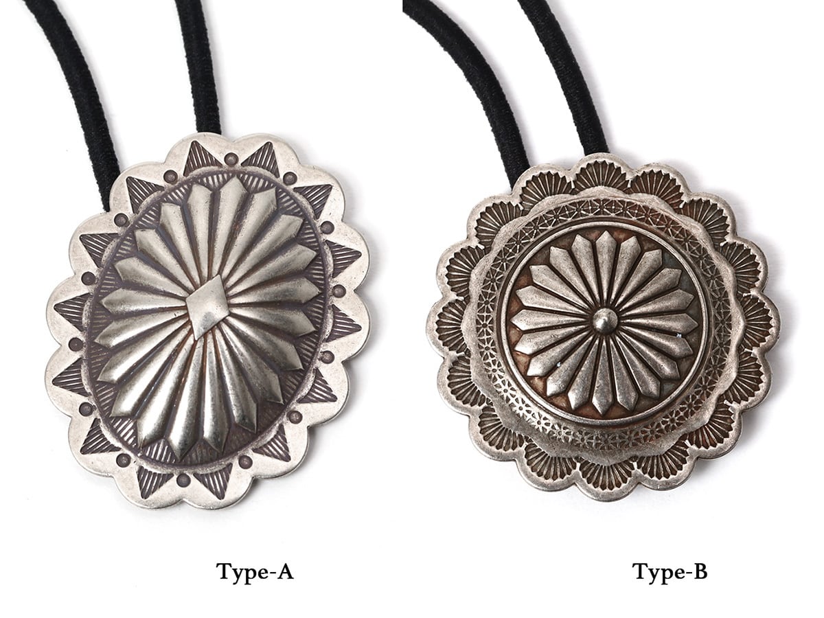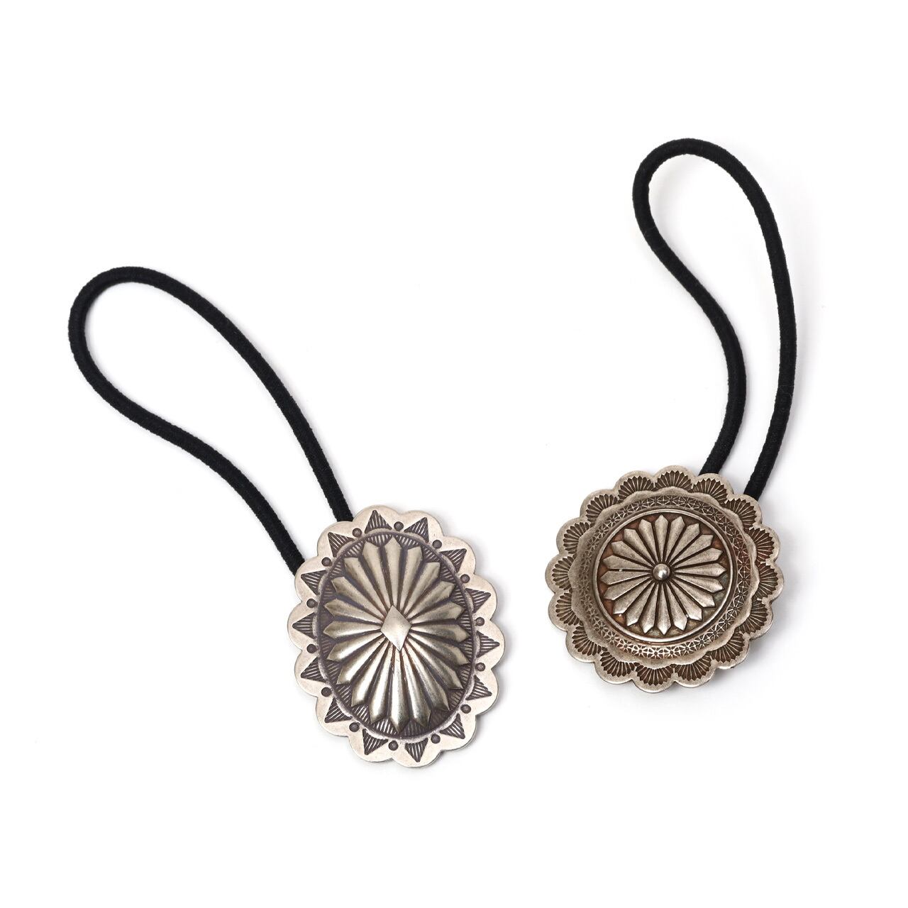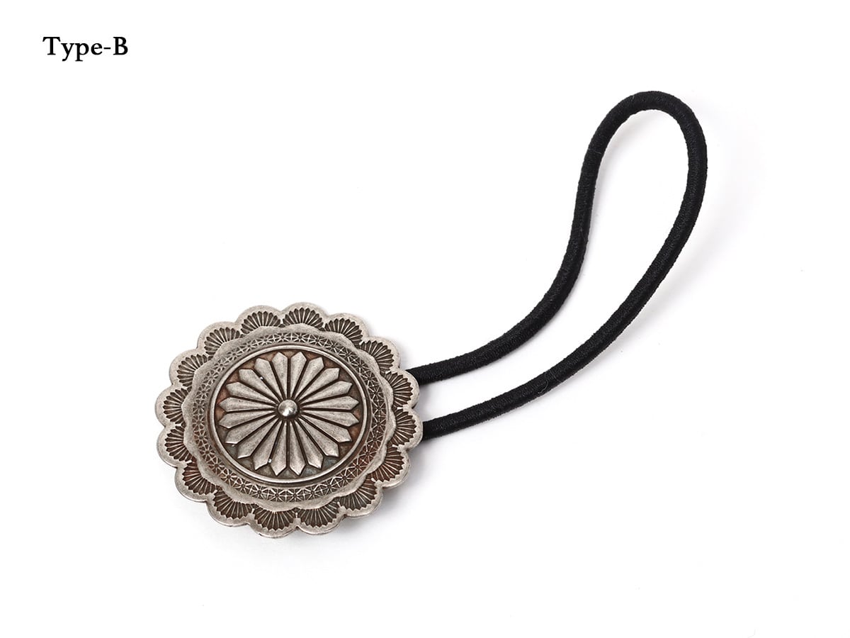 スタンプワークが目を引くジャーマンシルバーコンチョヘアゴムです。ヘアゴムは取り外しが可能。ブレスレットにしたりペンダントトップにしたりといろいろな使い方がお楽しみ頂けます。
