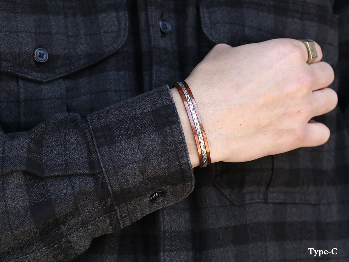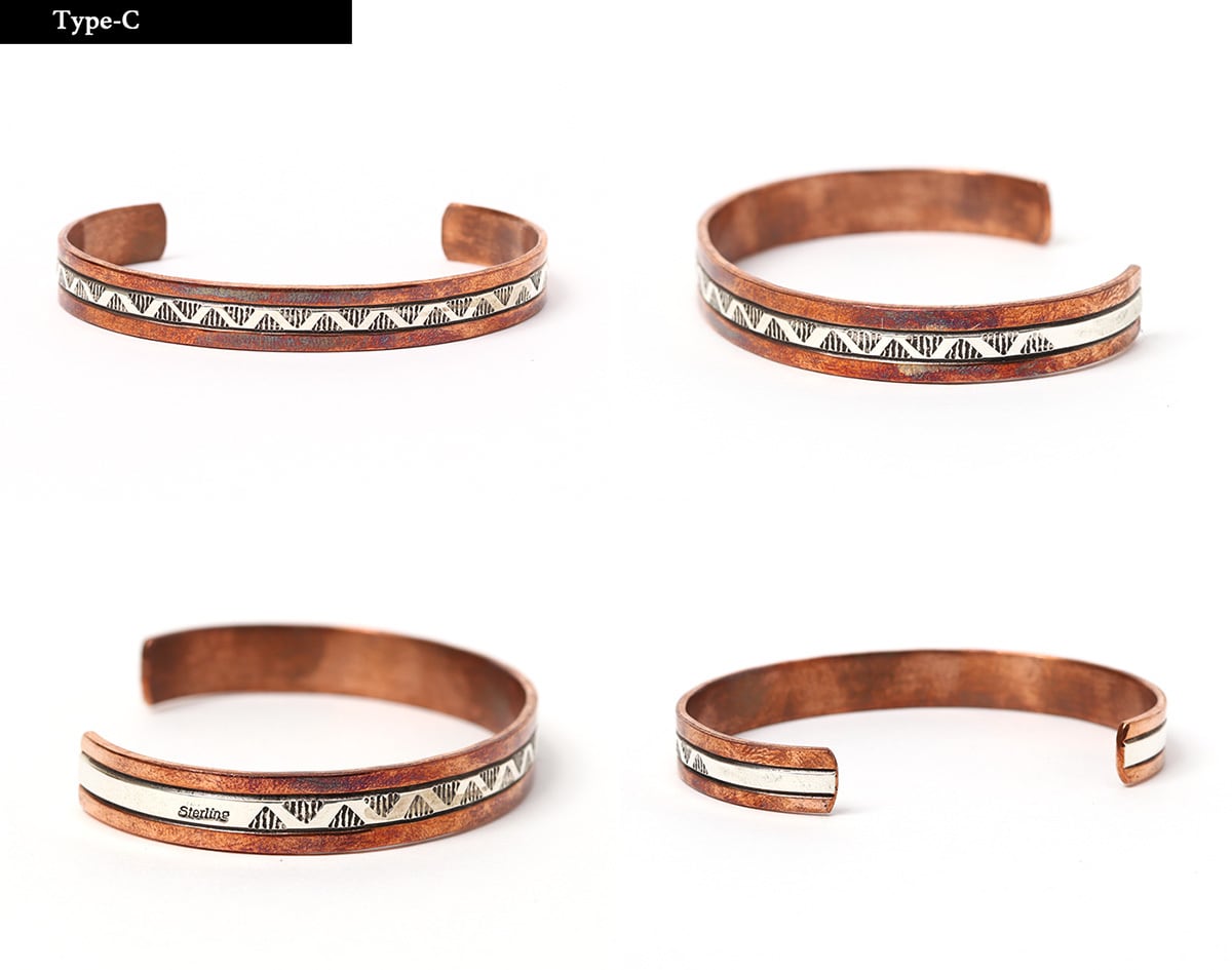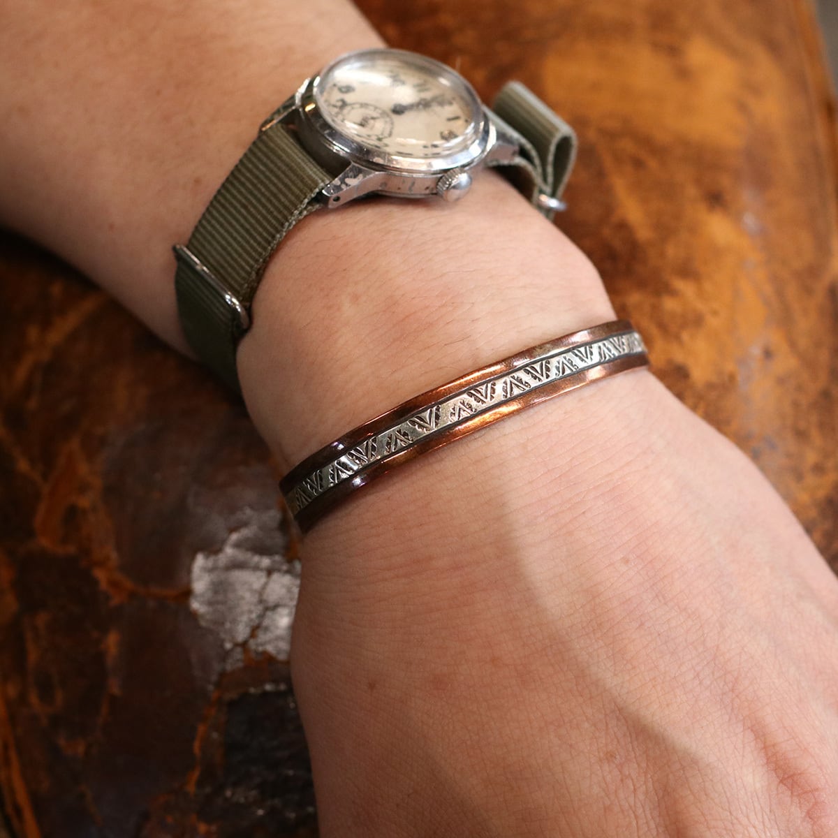 シルバーとカッパーを組み合わせた、印象的なコンビデザインが魅力の一品。異なる金属のコントラストが程よい存在感を生み出し、シンプルながらも個性を感じさせます。幅約8mmと使い勝手の良いサイズ感で、日常使いはもちろん、さりげないアクセントとしてもおすすめです。スタイルを選ばず取り入れやすく、長く愛用していただけるジュエリーに仕上がっています。