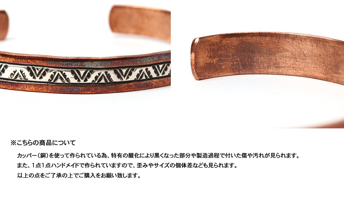 ※カッパー(銅)を使って作られている為、特有の酸化により黒くなった部分や製造過程で付いた傷や汚れが見られます。また、1点1点ハンドメイドで作られていますので、歪みやサイズの個体差なども見られます。以上の点をご了承の上でご購入をお願い致します。