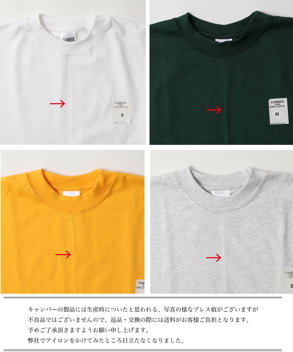 きっちりときつく編まれ、より丈夫に仕上げられた生地。ヘビーで厚手なTシャツは長く付き合って行きたい一着です。また、CAMBERの製品はすべてアメリカ製。すべての糸、布、縫製に至るまで、全てアメリカで作り続けているというこだわりが魅力です。発色の良いベーシックカラーは、特別な染料を使用し、その色を保ち続けてくれます。