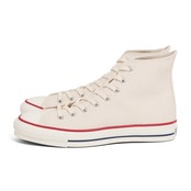 オールスターのMADE IN JAPANモデル・ハイカットスニーカーです。生産は福岡・久留米のMOONSTAR。通常のキャンバスオールスターとは異なる生成りテープ、コットンシューレースを使用。ヒールラベルの下部分に「MADE IN JAPAN」が印字されています。ホワイトのキャンバスに赤字で印されたインソールのコンバースロゴは、日本の国旗をイメージしています。 オリジナルカートンボックス仕様。